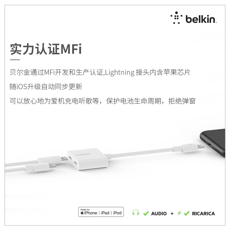 BELKIN贝尔金Lightning转3.5充电听歌2合1分线器转接头适用于苹果(苹果在售同款)