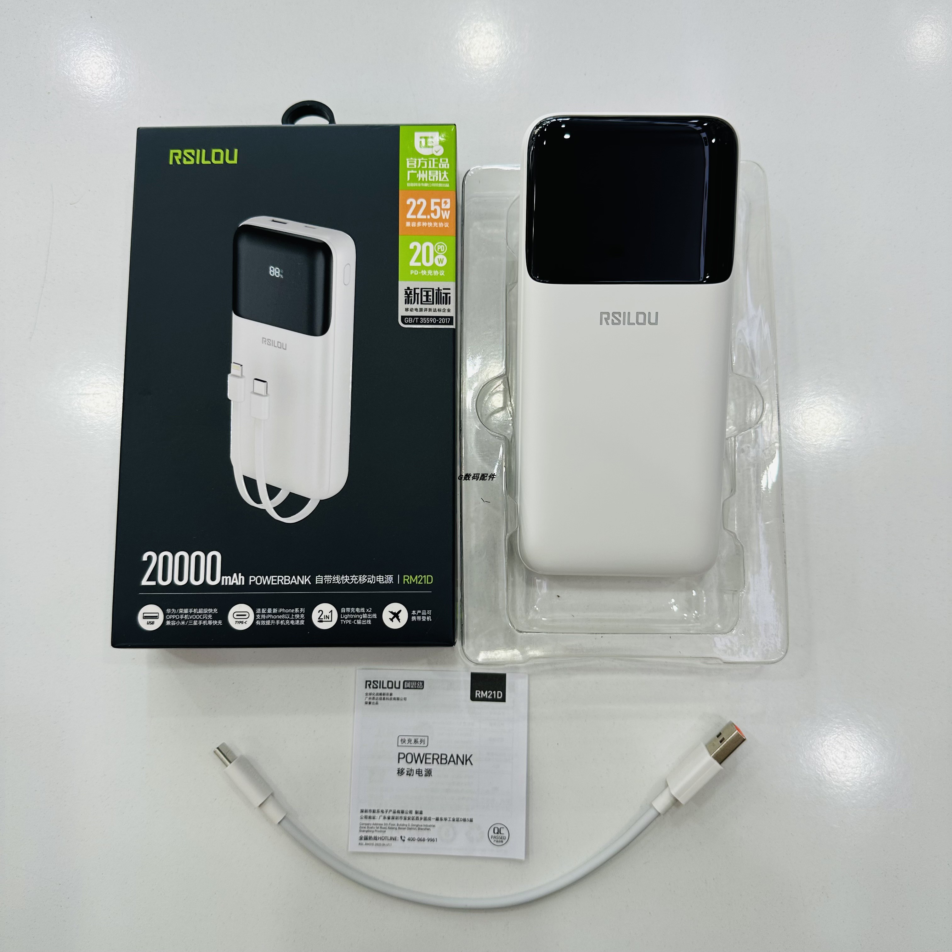 阿思络RM21D自带线充电宝电量显示2万大容量支持pd快充移动电源