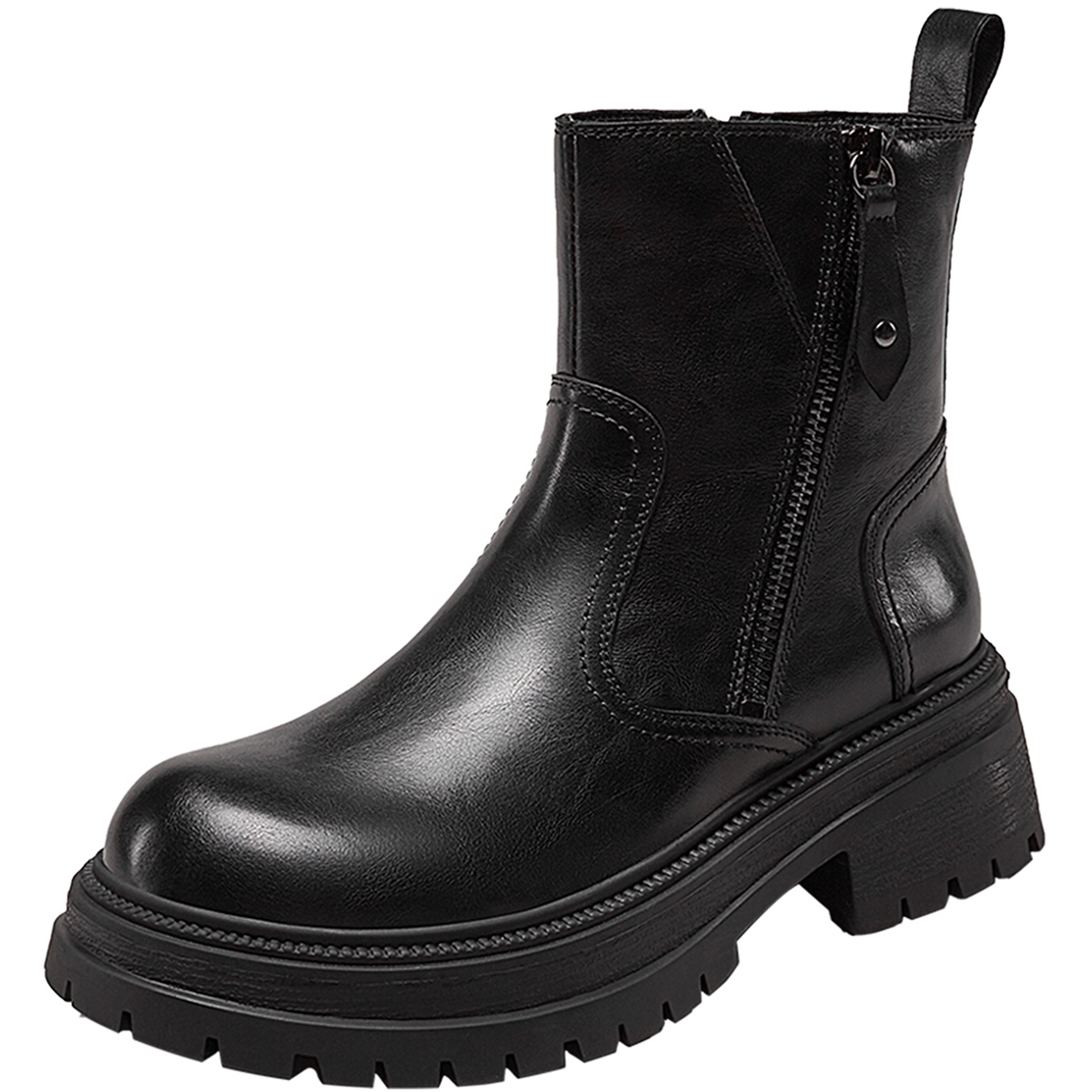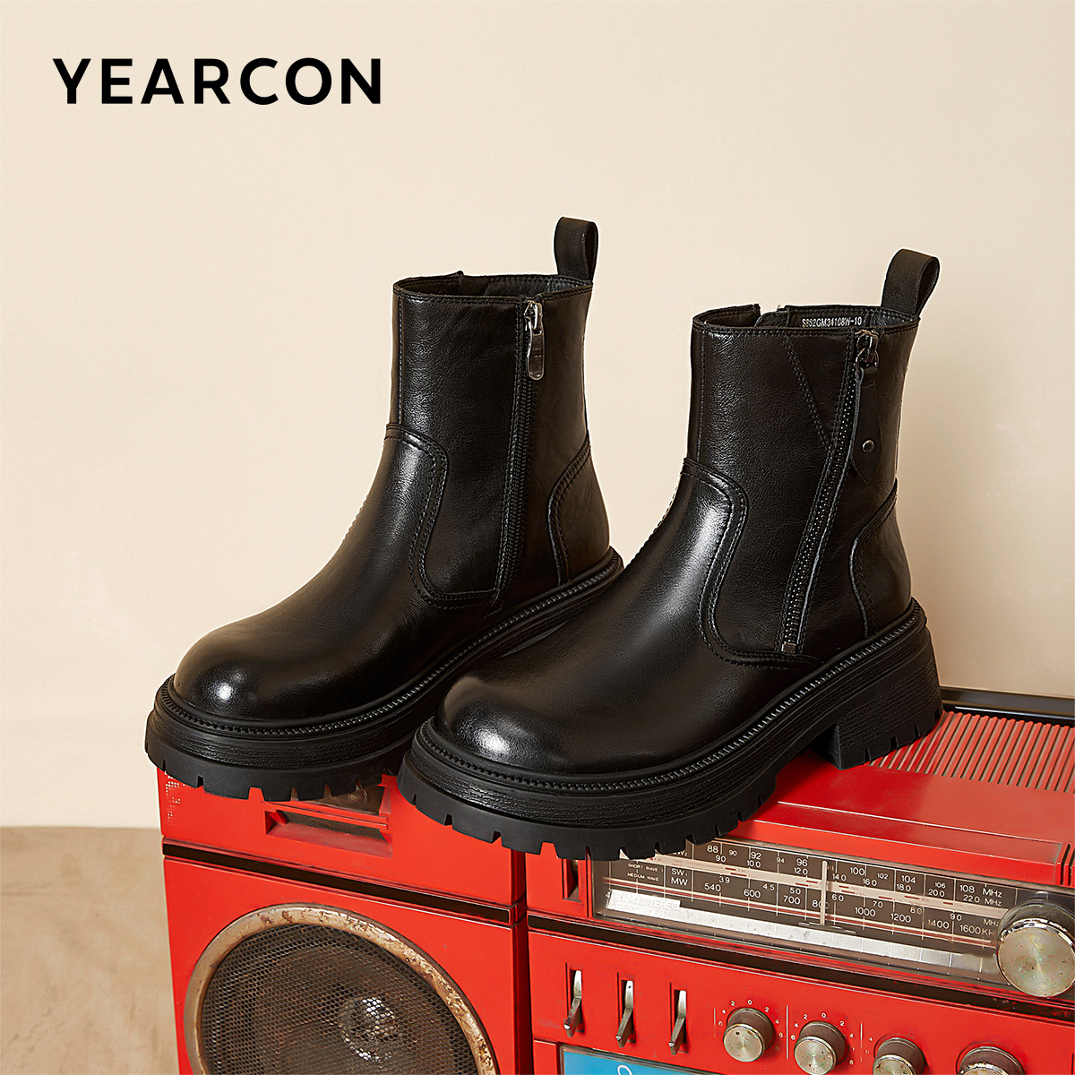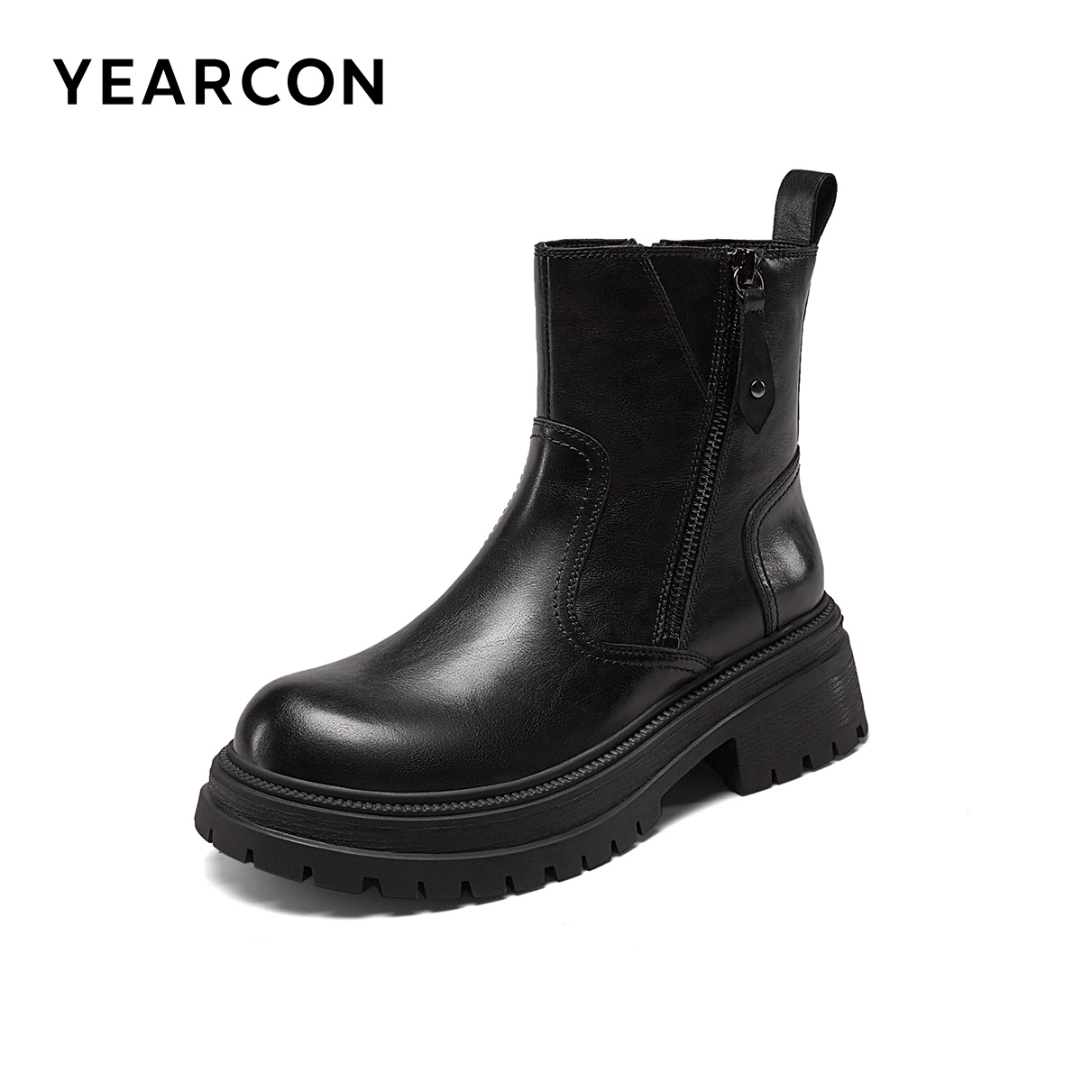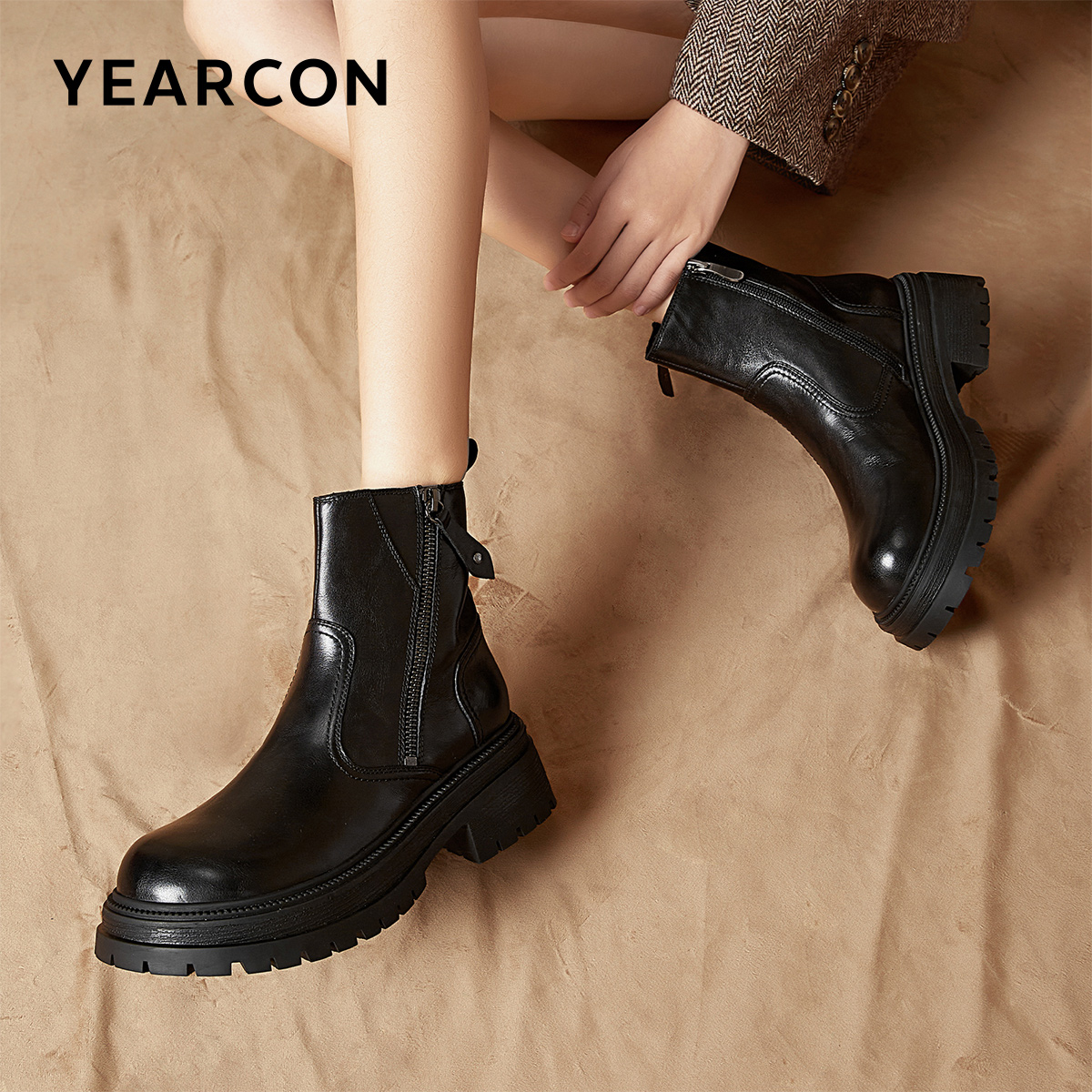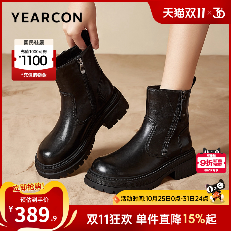意尔康女鞋秋冬休闲真皮短靴粗跟单靴气质英伦显瘦及踝靴女士皮鞋