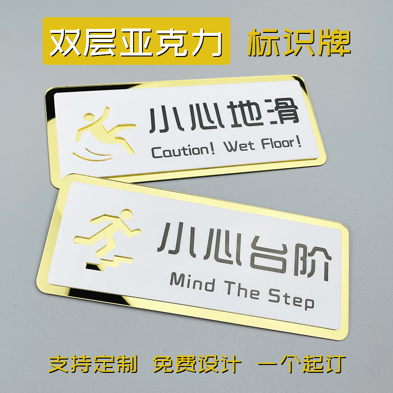镜面金亚克力小心碰头小心台阶地滑小心玻璃高温小心烫伤标识牌上下楼梯注意安全温馨提示牌创意标牌定制贴