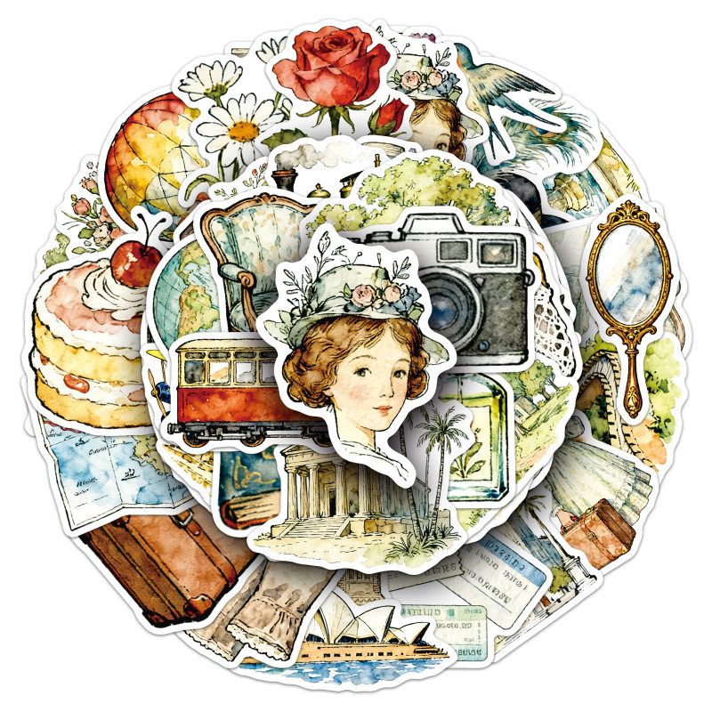50张复古旅行少女贴纸艺术风小清新卡通装饰手账本耳机手机壳贴纸