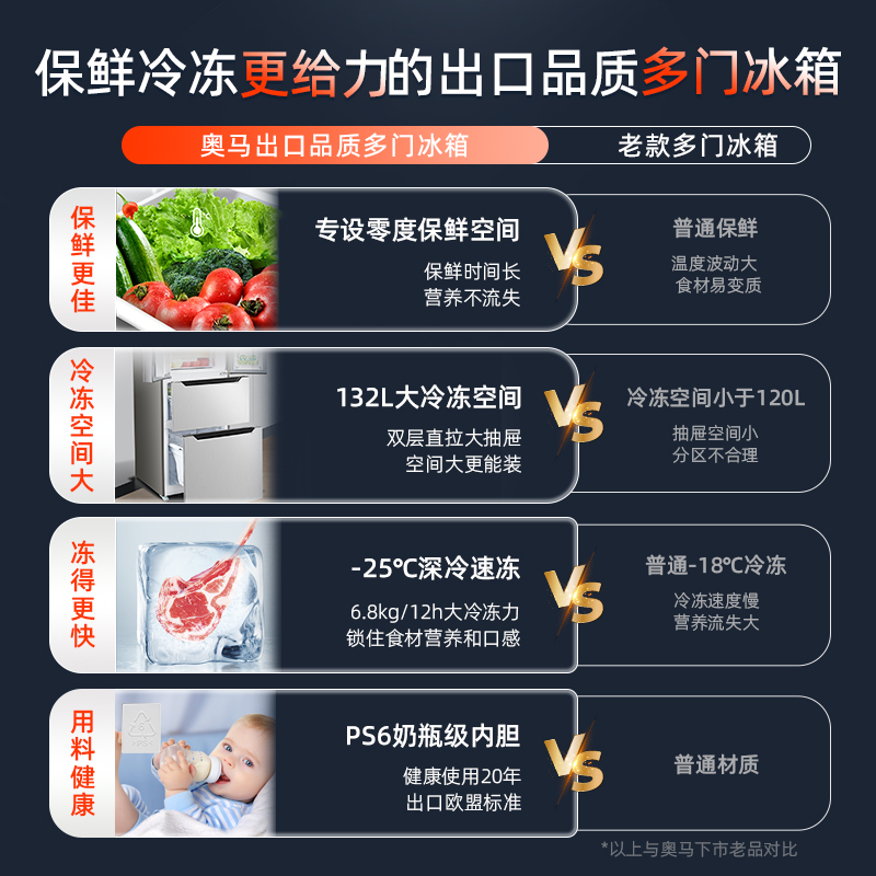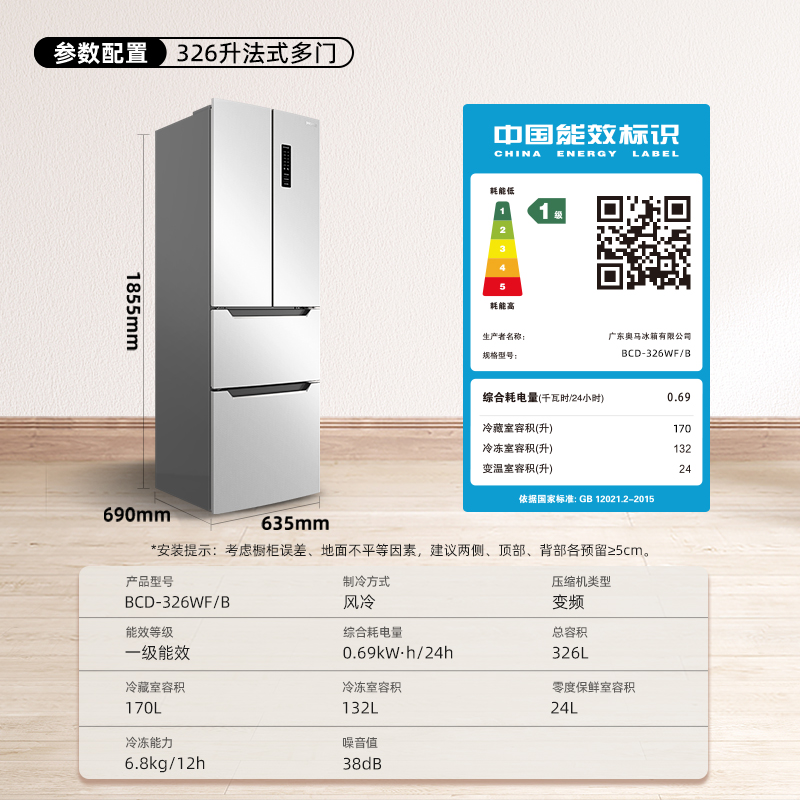 奥马冰箱326L家用一级能效法式四开门变频风冷无霜国补电冰箱超薄