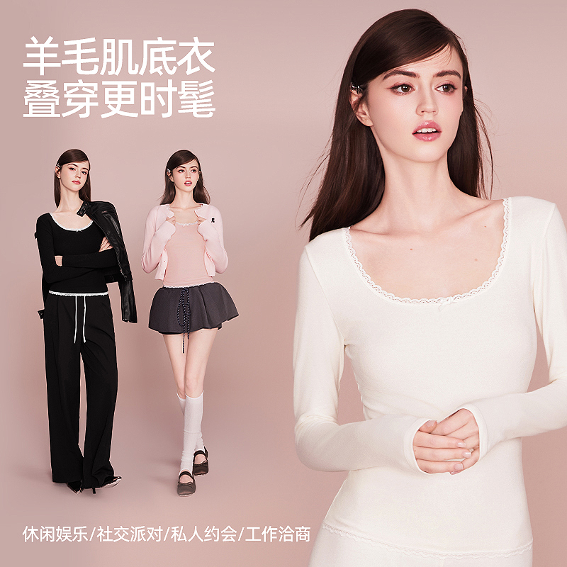 好奇蜜斯羊毛保暖内衣女发热抗静电肌底衣秋冬内搭打底衫加绒秋衣