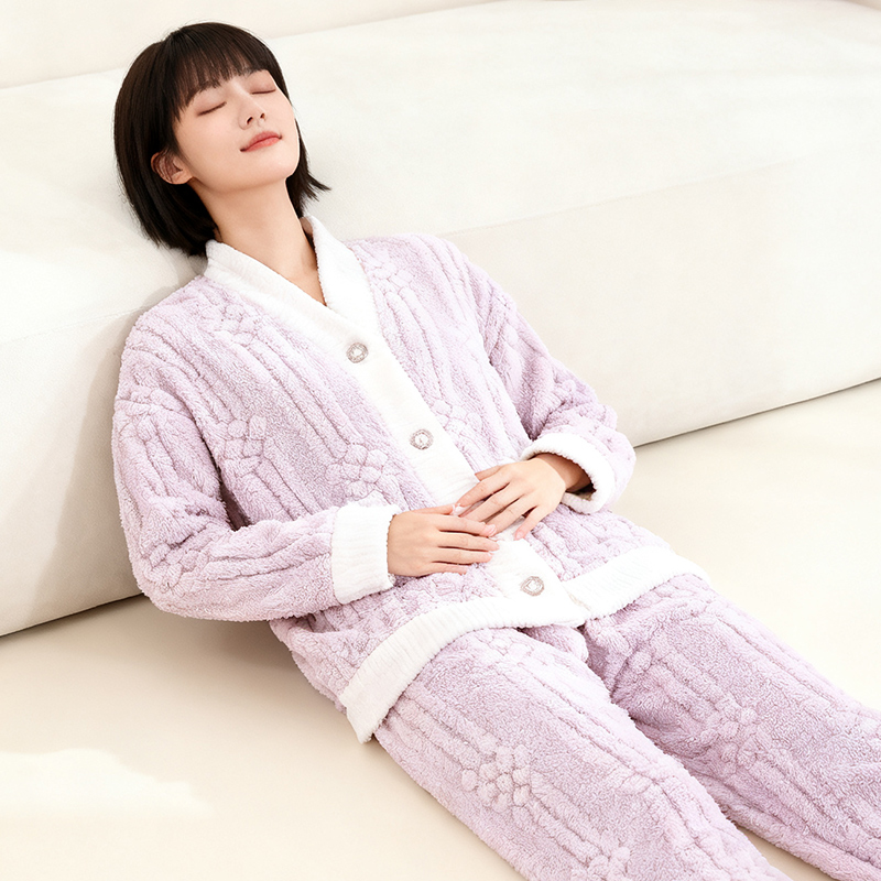 2025新款睡衣女秋冬季法兰绒加厚V领长袖舒棉绒家居服套装可外穿