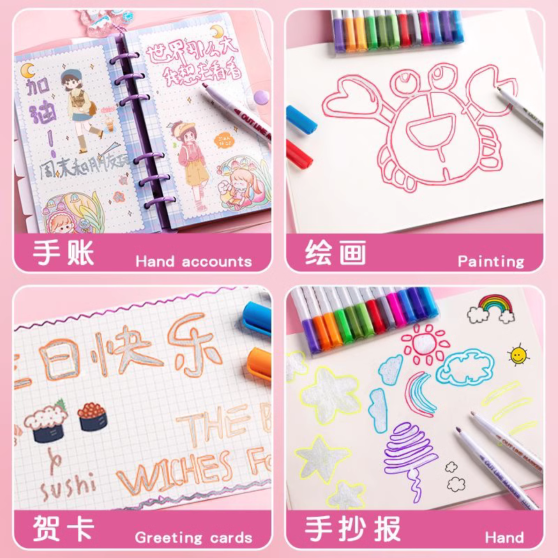 双线轮廓笔闪光手抄报手帐专用24色双色荧光写字学生儿童用花型手账彩色曲线果冻笔描边画报啫喱记号闪粉神器