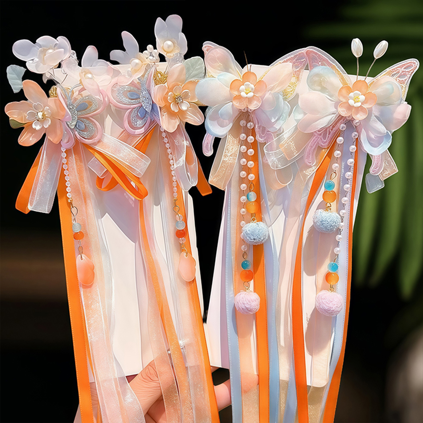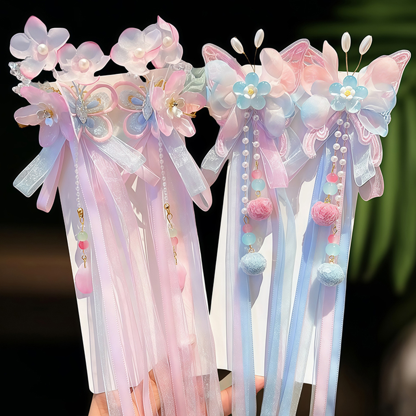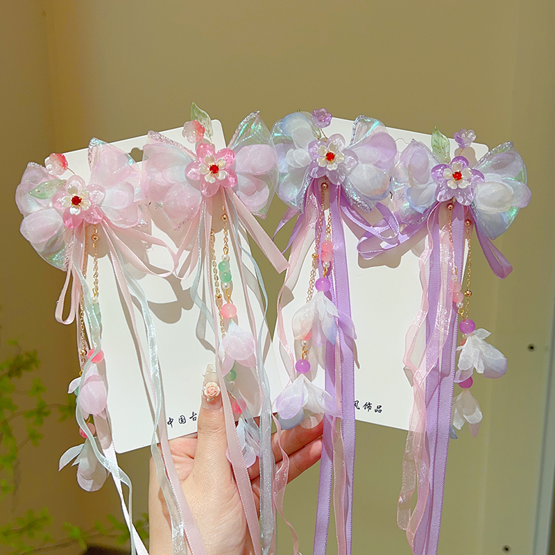 中国风儿童汉服头饰小女孩古风飘带发夹超仙蝴蝶流苏编发古装发饰