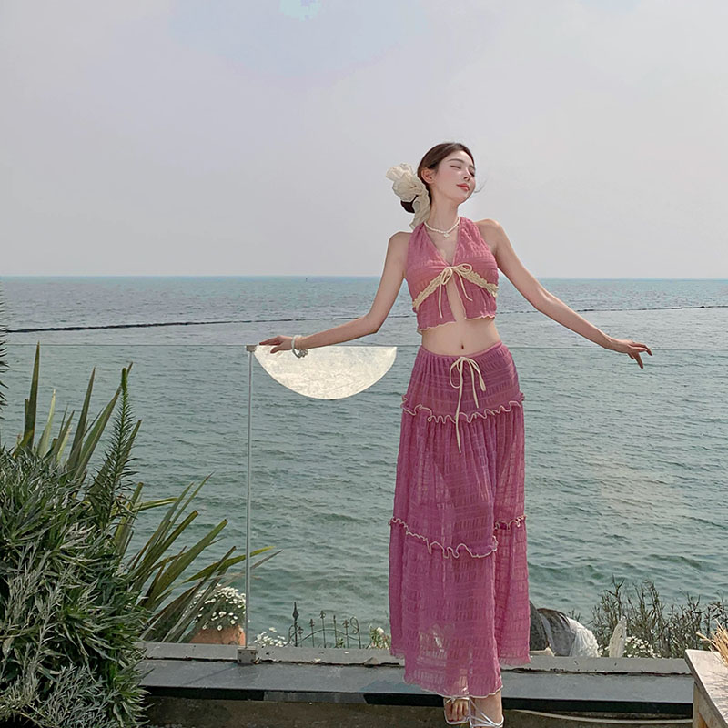 法式气质仙女拍照高级感比基尼海岛度假分体式长袖露腰泡温泉泳衣