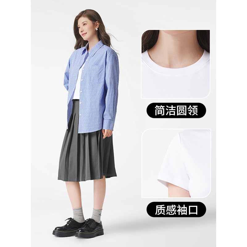 三福长袖上衣女2025新款秋季圆领内搭打底衫简约修身白色t恤女装