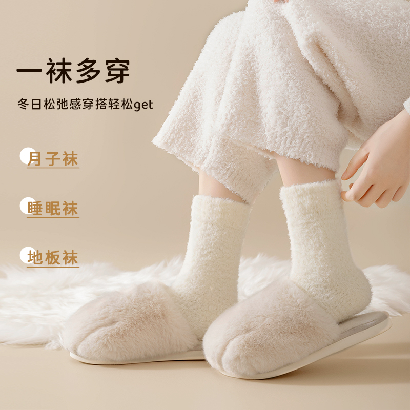 珊瑚绒睡觉穿的袜子女中筒秋冬季加厚加绒保暖产后月子居家地板袜