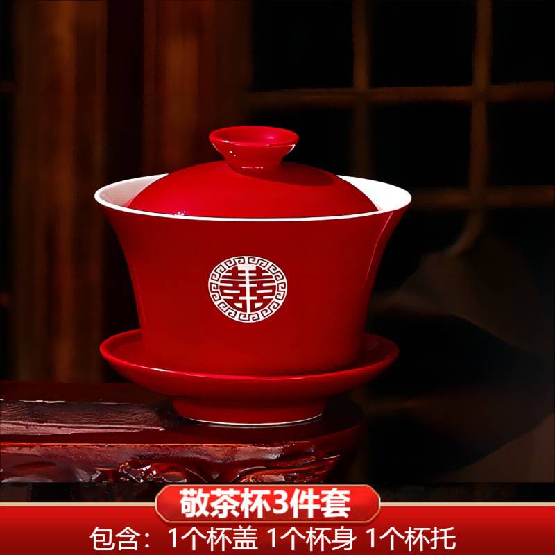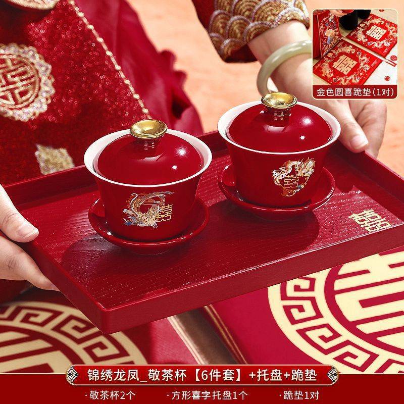 改口敬茶杯结婚套装一对盖碗筷红色喜庆喜碗陪嫁茶具婚礼子孙对碗