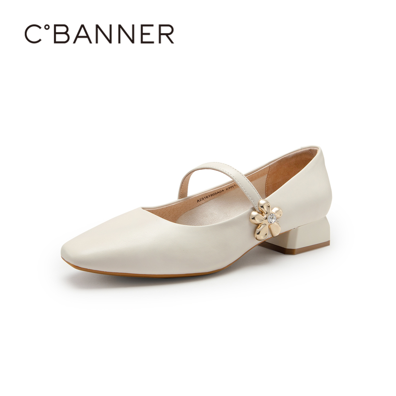 千百度女鞋秋季新款玛丽珍芭蕾舞法式单鞋中跟气质真皮晚晚鞋