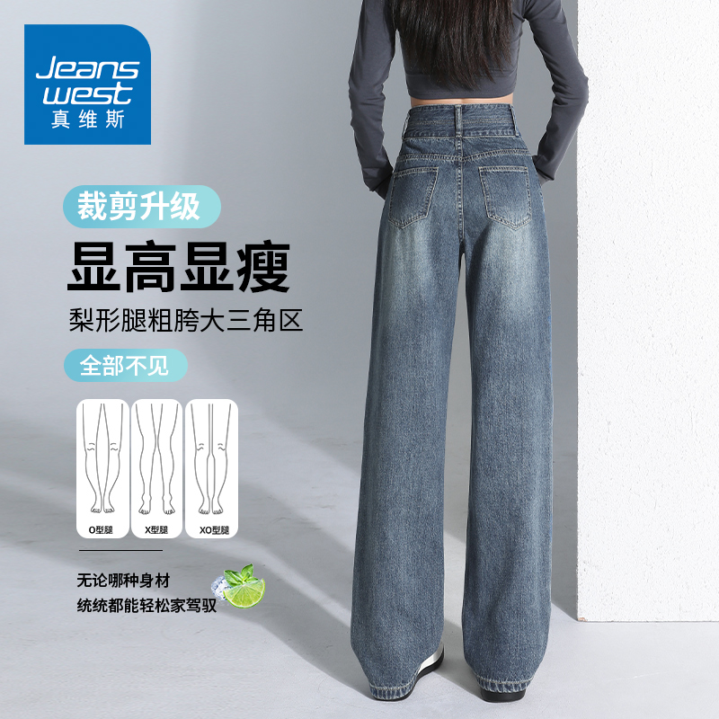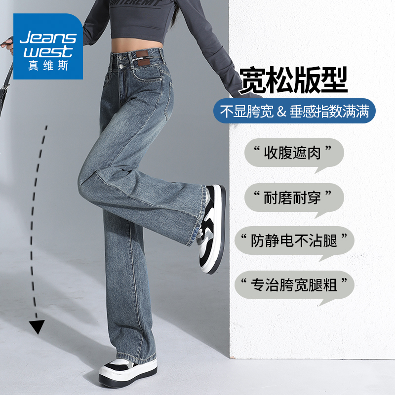 KZH真维斯高端加绒牛仔裤女秋冬新款宽松直筒裤高腰阔腿双扣长裤