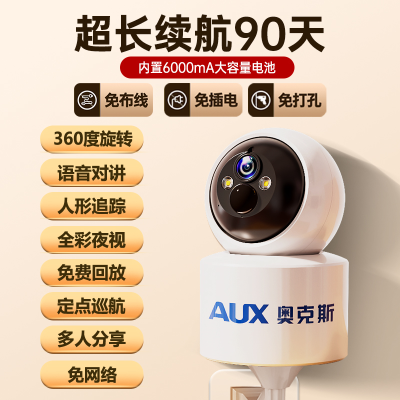 奥克斯无线摄像头4G无需网络手机远程家用室内免插电360度监控器