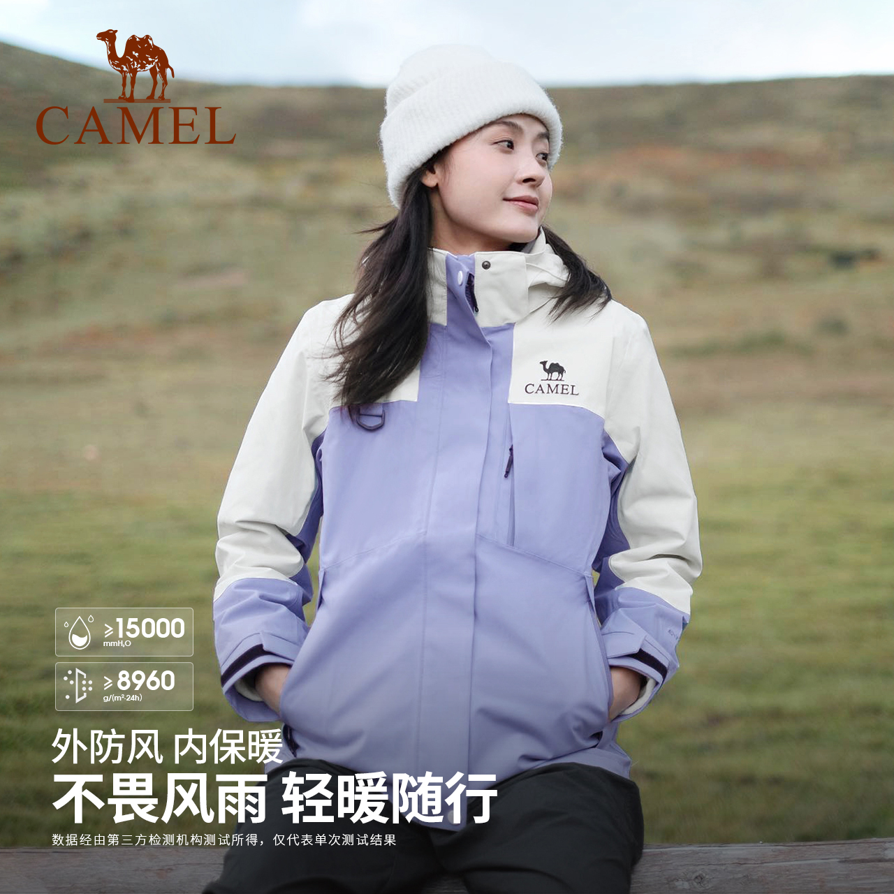 骆驼户外紫玫红冲锋衣女暴雨防水防风外套男三合一两件套登山服装