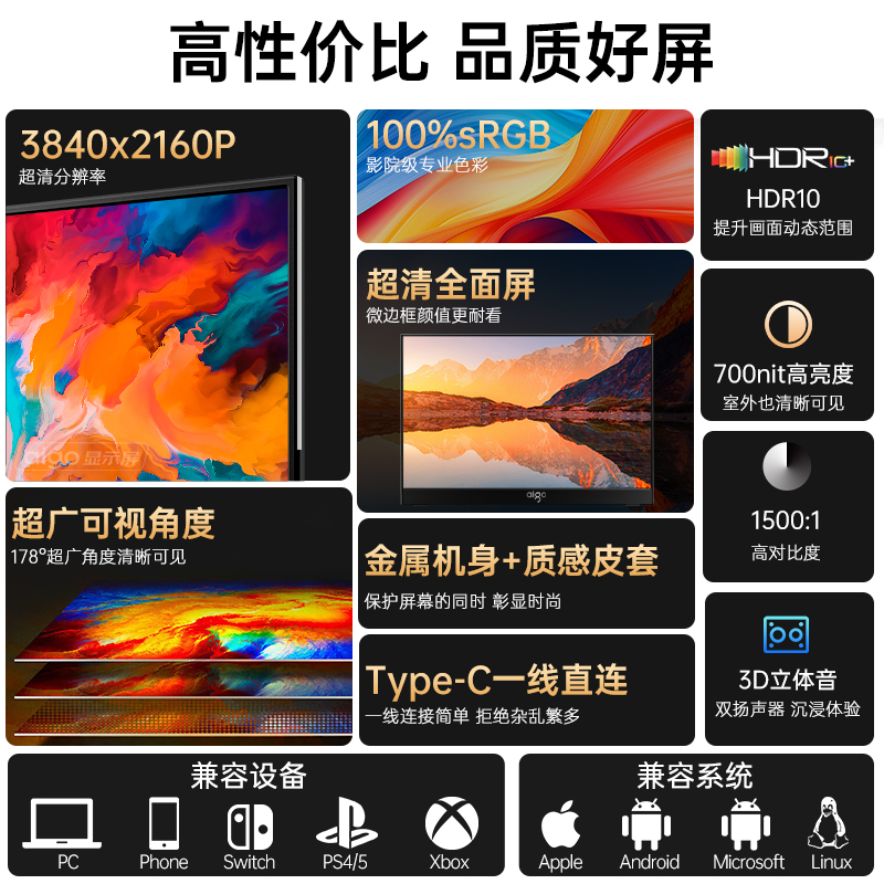 爱国者15.6英寸便携显示器4k扩展屏笔记本144HZ副屏switch外接屏