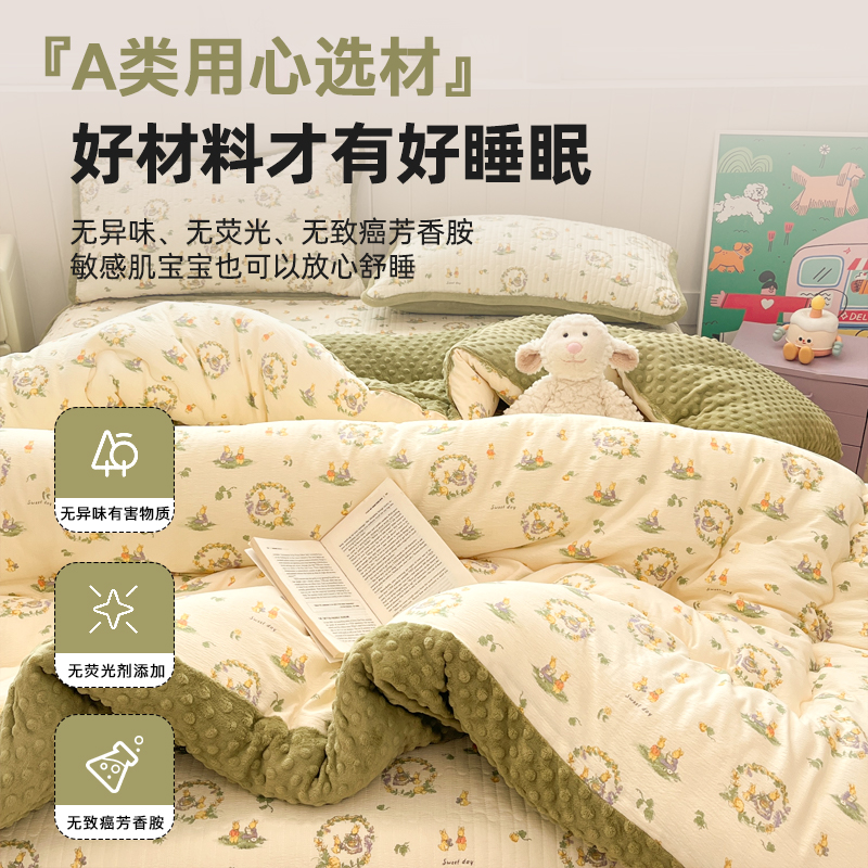 双层纱豆豆绒四件套被子被芯冬被春秋被单人被套加厚保暖床盖套件