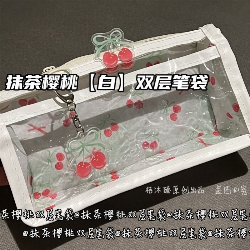 抹茶樱桃透明双层笔袋2025新款ins女生小众小学初中ins风高颜值学生少女心大容量文具收纳笔袋小学生可爱