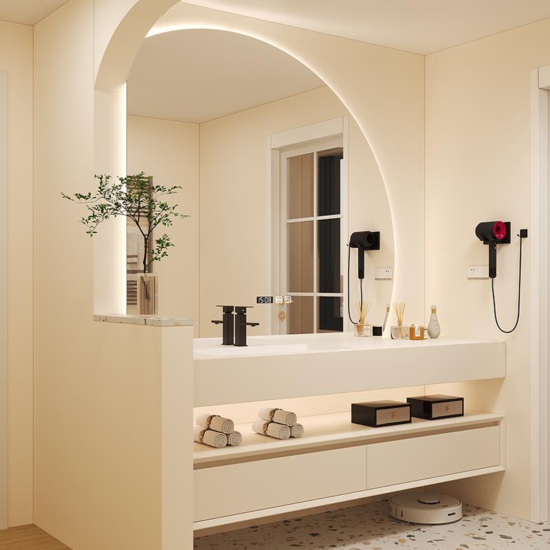 奶油风岩板一体盆浴室柜组合橡胶木轻奢设计师定制洗手脸池洗漱台饰品