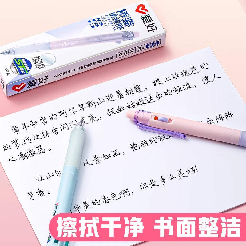 爱好摩易擦按动中性笔ST尖0.5mm可擦笔小学生专用三年级晶蓝热可擦高颜值刷题笔练字笔黑色私人定制刻字姓名