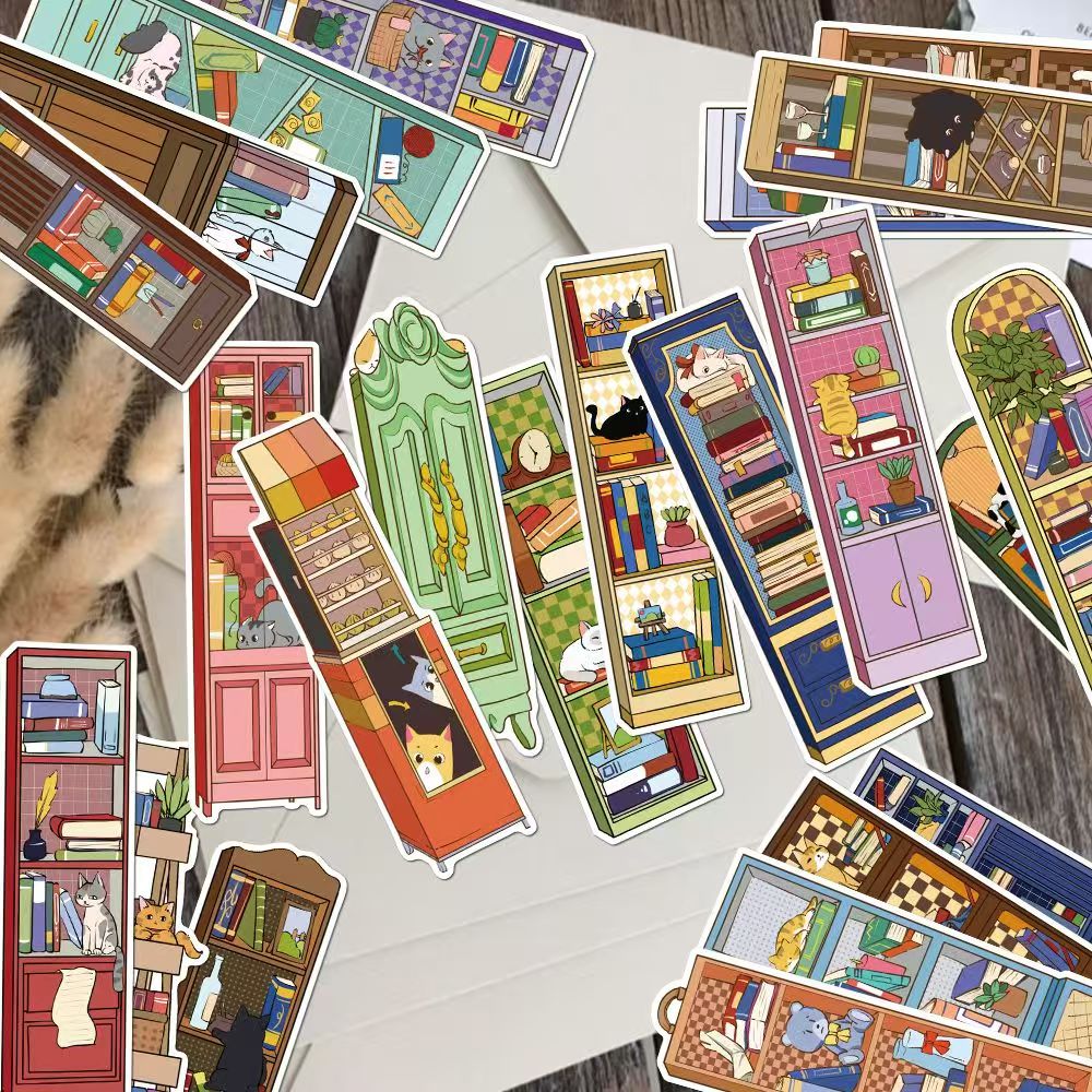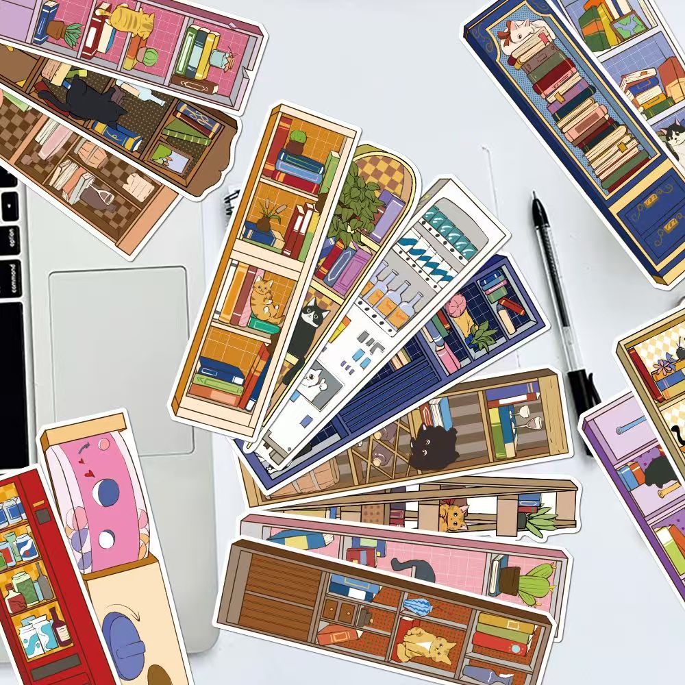 60张猫柜书签小猫咪场景卡通可爱图案创意阅读书页书籍标注标记