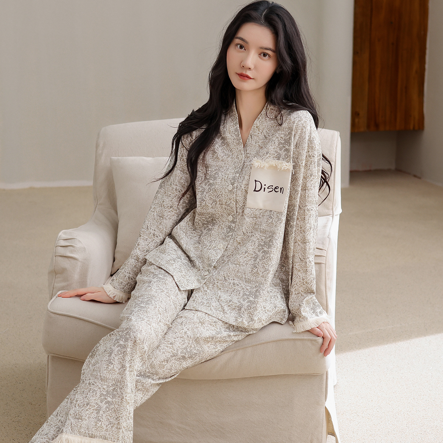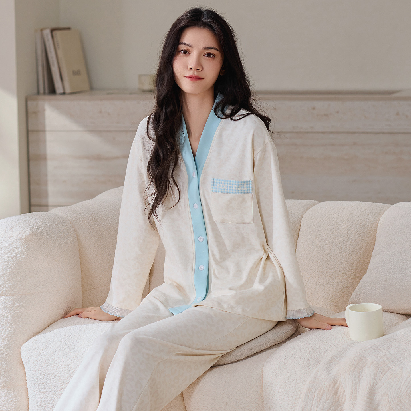 新款纯棉秋季睡衣女和服V领开衫气质晕染蓝长袖长裤春家居服套装