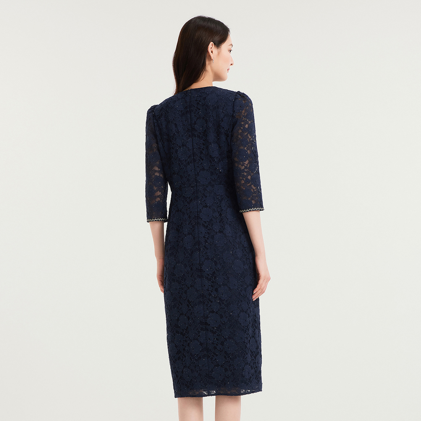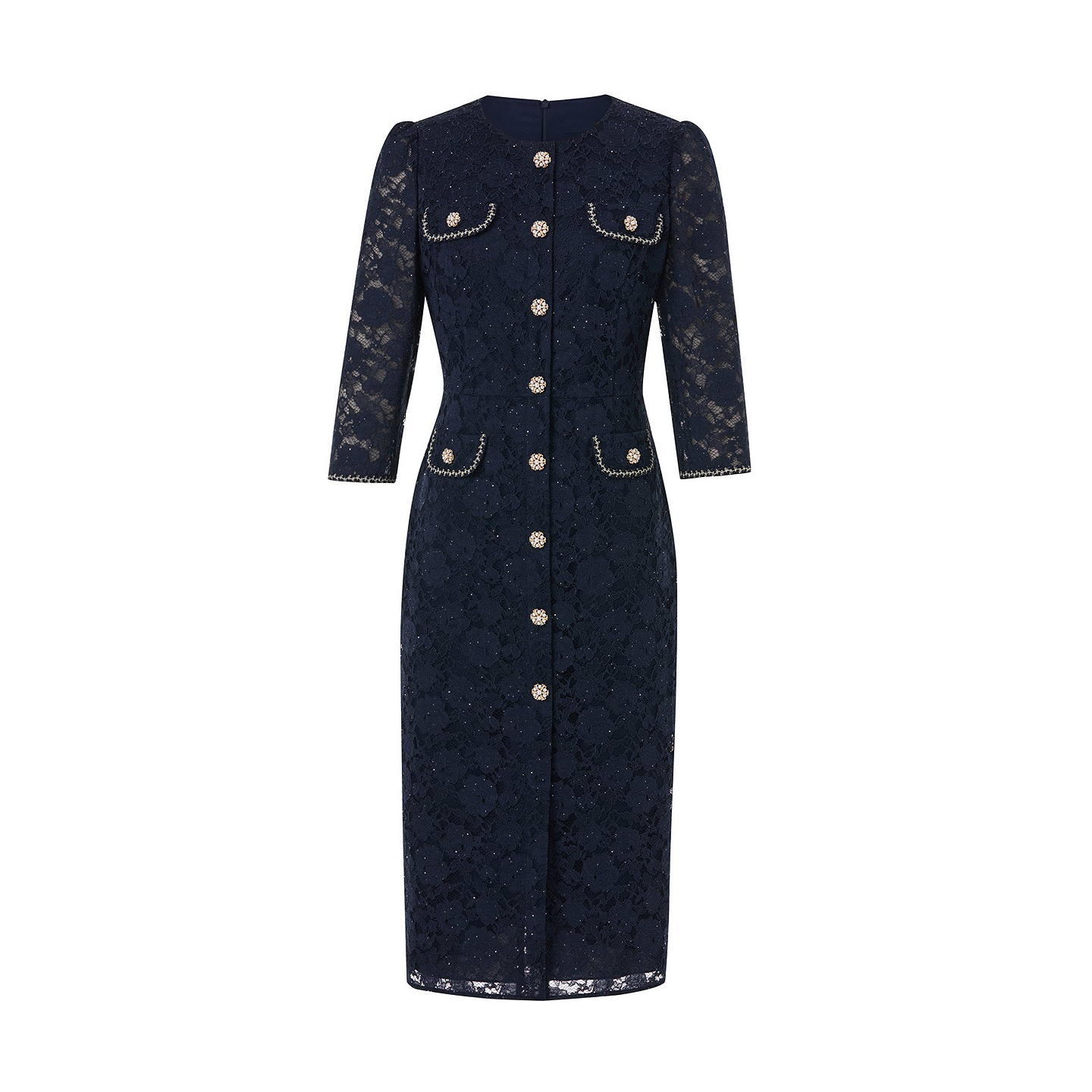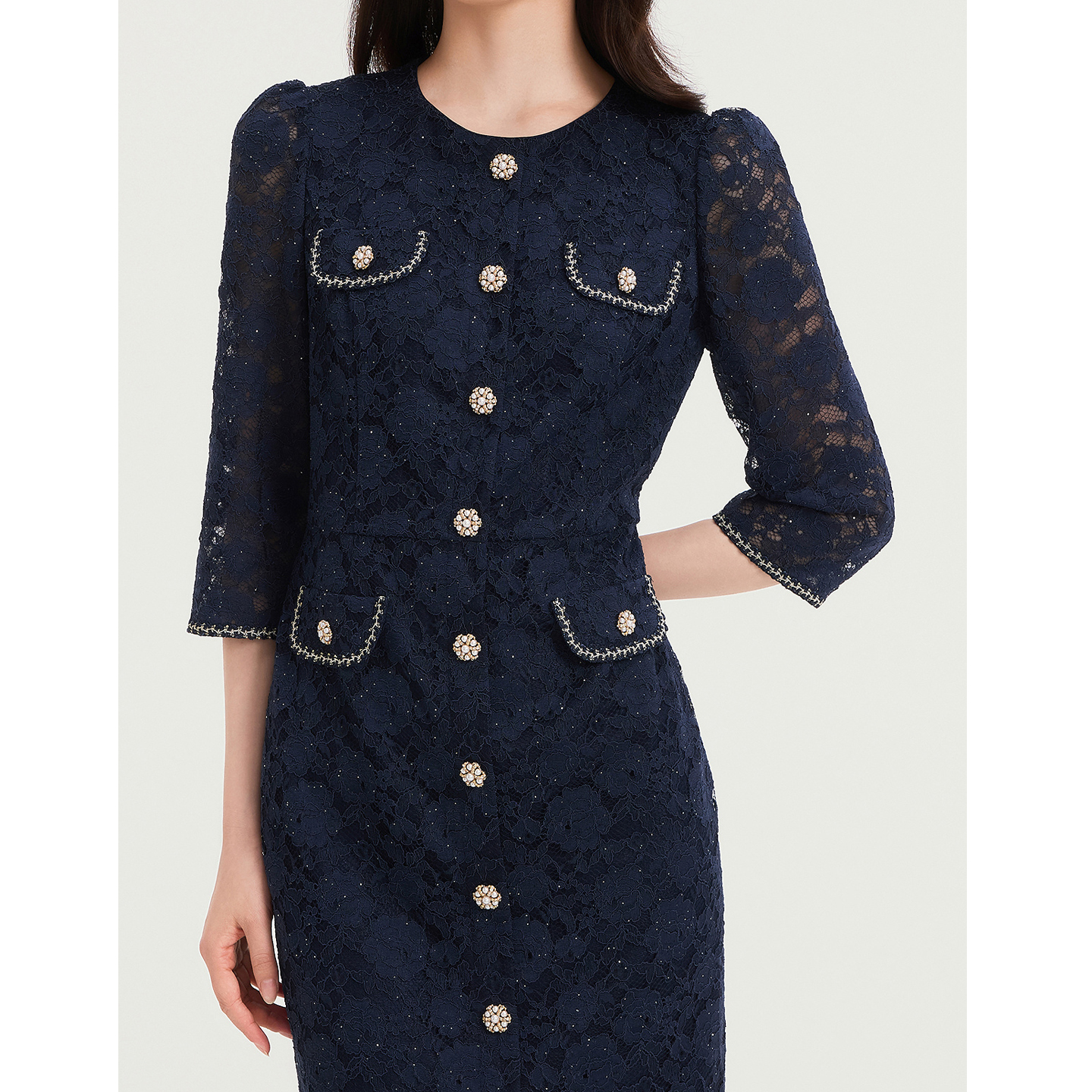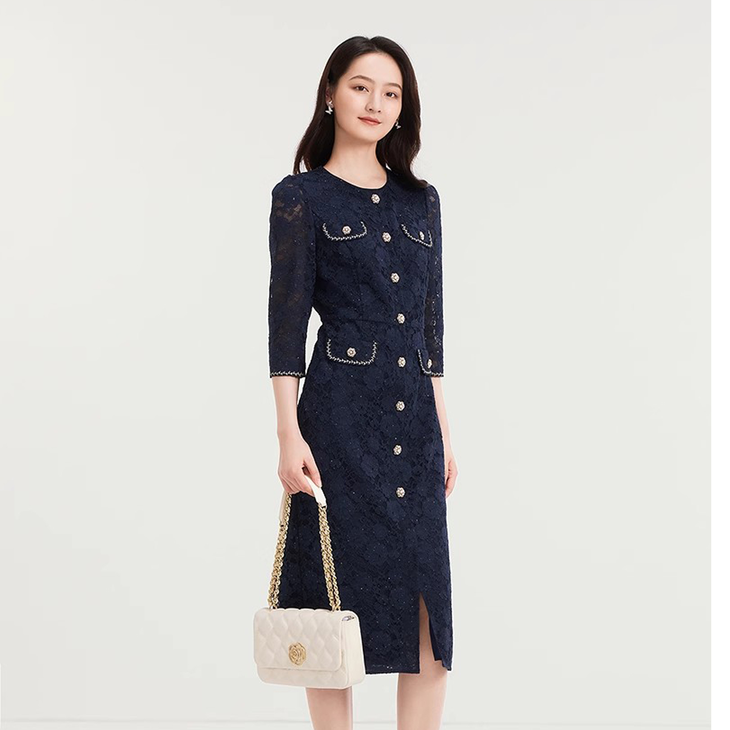 珂莱商场同款2025秋季新款女装法式优雅圆领收腰中长款蕾丝连衣裙