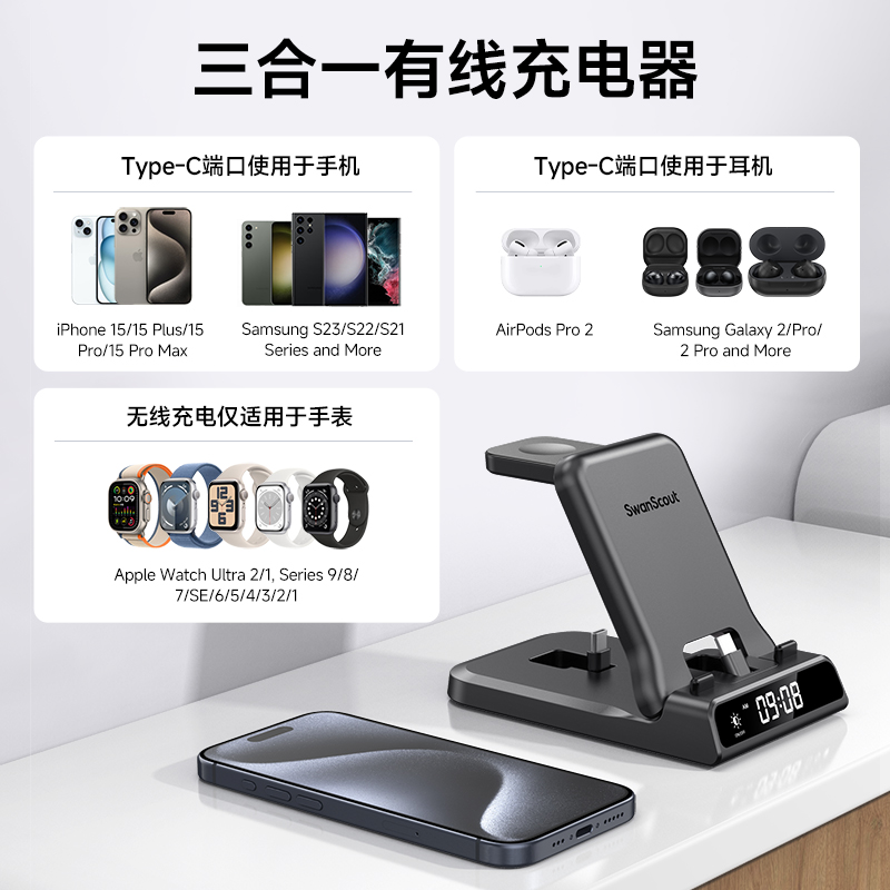 白鹄SwanScout701AC 适用于苹果17 16为iPhone Apple Watch11 AirPods折叠时钟三合一便携式充电器无线充电站