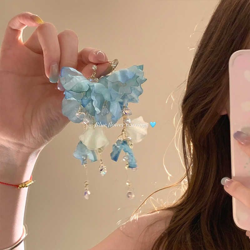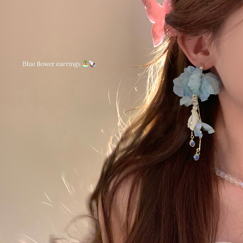 玫瑰冰茶~蓝色流苏花朵耳钉女高级感度假风小众耳环绝美耳饰耳夹