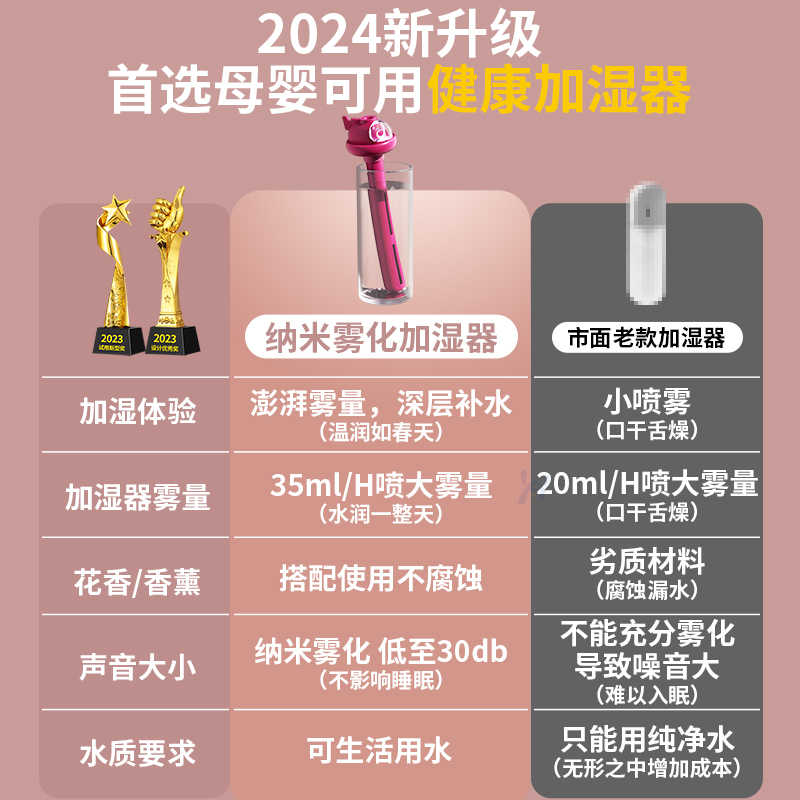静音2024新款无线加湿器小型迷你usb充电便携式办公室桌面空气香薰喷雾家用轻音卧室宿舍学生矿泉水加湿车载J