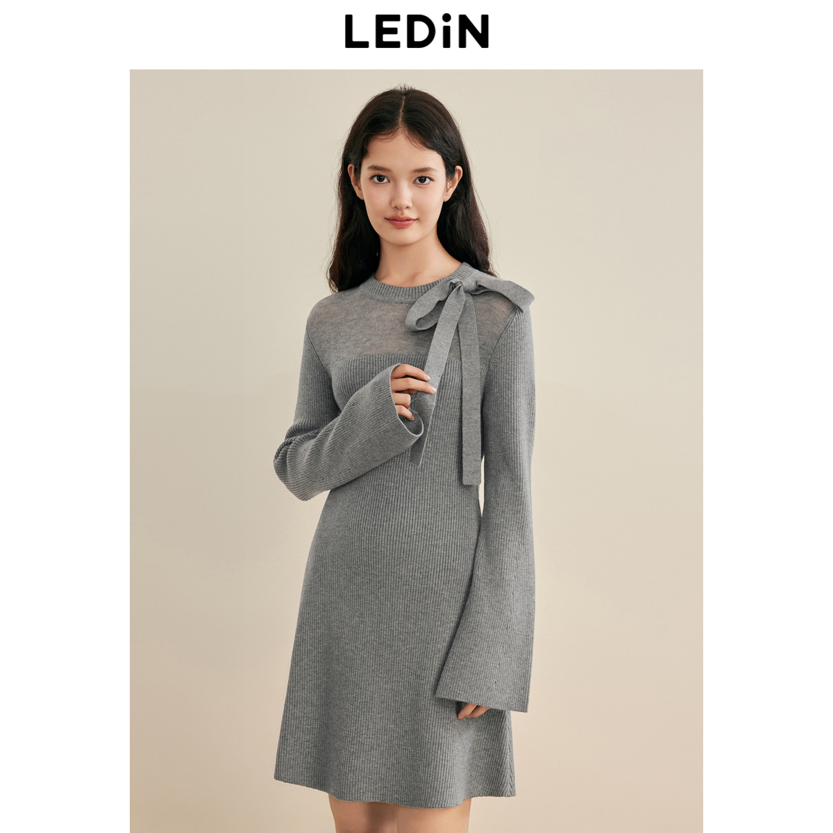 乐町千金风长袖连衣裙冬季新款肩部蝴蝶结设计显瘦灰色连衣裙
