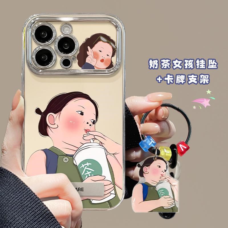 速发适用15手机壳iPh14pm奶茶孩支架挂坠12电镀6D视窗硅胶11