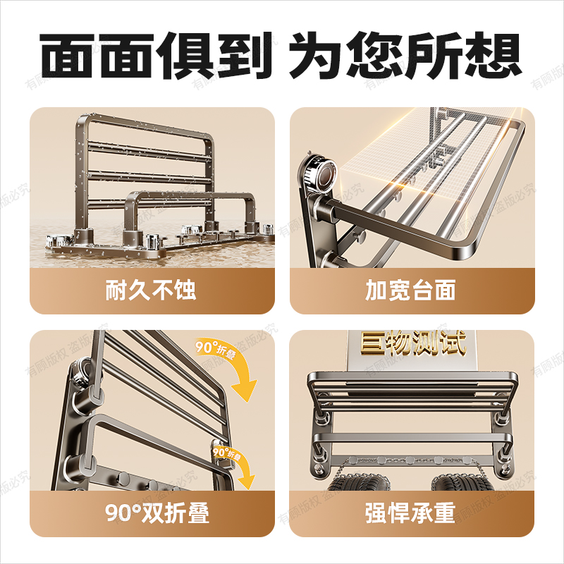 双杆吸盘毛巾架家用浴室免打孔收纳带挂钩干湿两用轻奢挂杆置物架