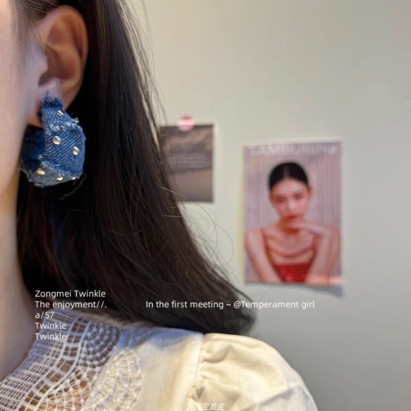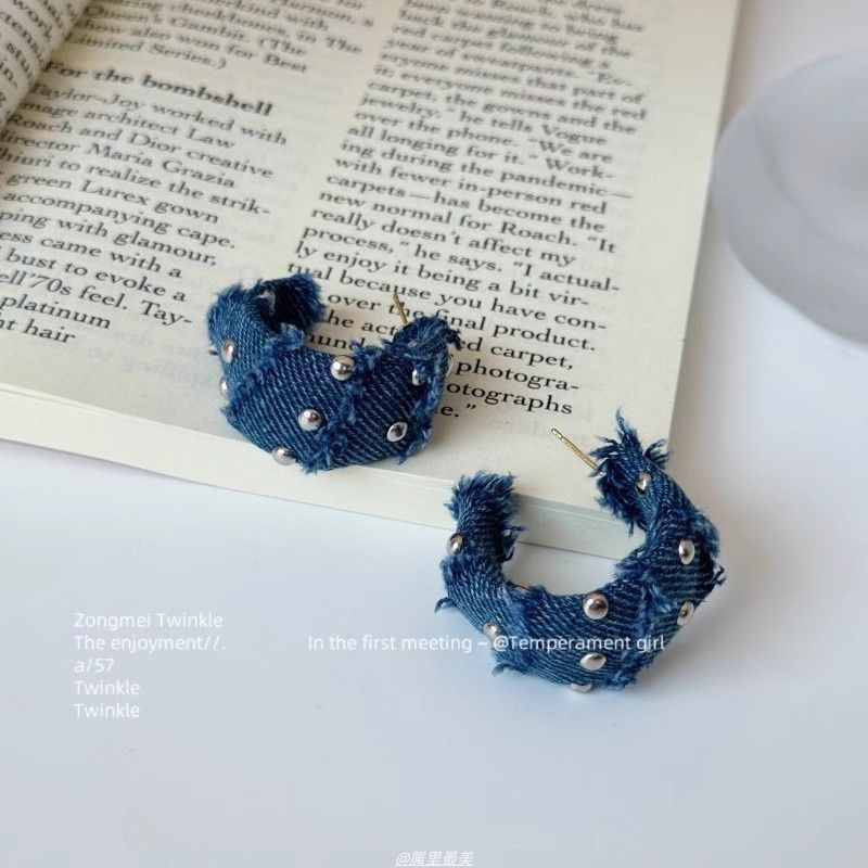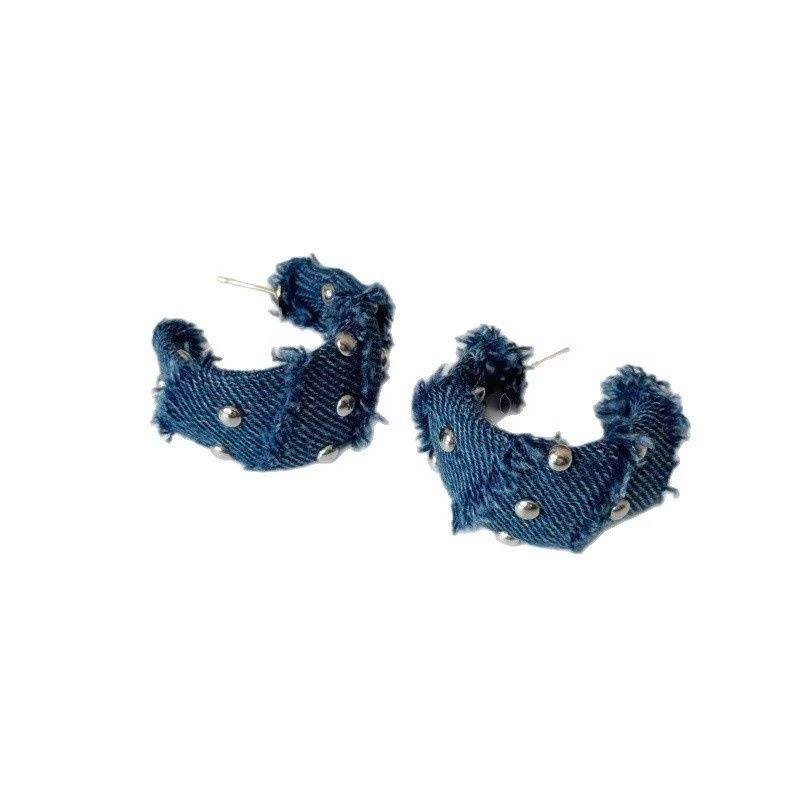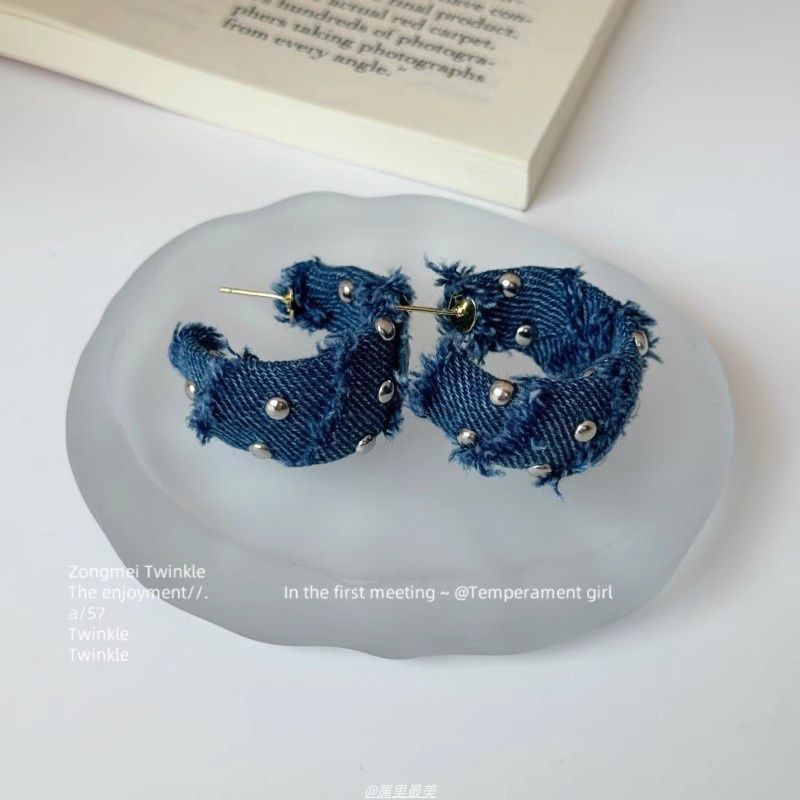 美式缠绕蓝色牛仔铆钉C型耳环圆圈女高级感复古港风小众耳饰耳圈