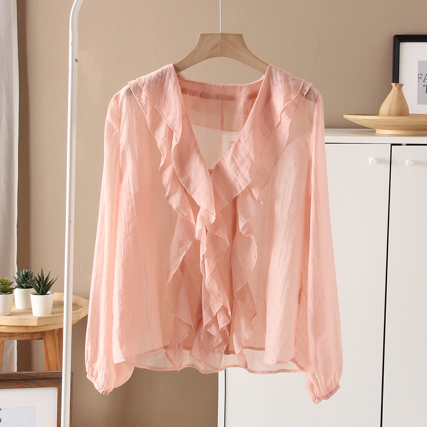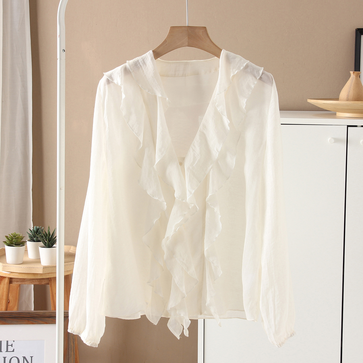 减龄叠层荷叶边V领宽松显瘦百搭长袖衬衫法式气质透视感上衣衬衣