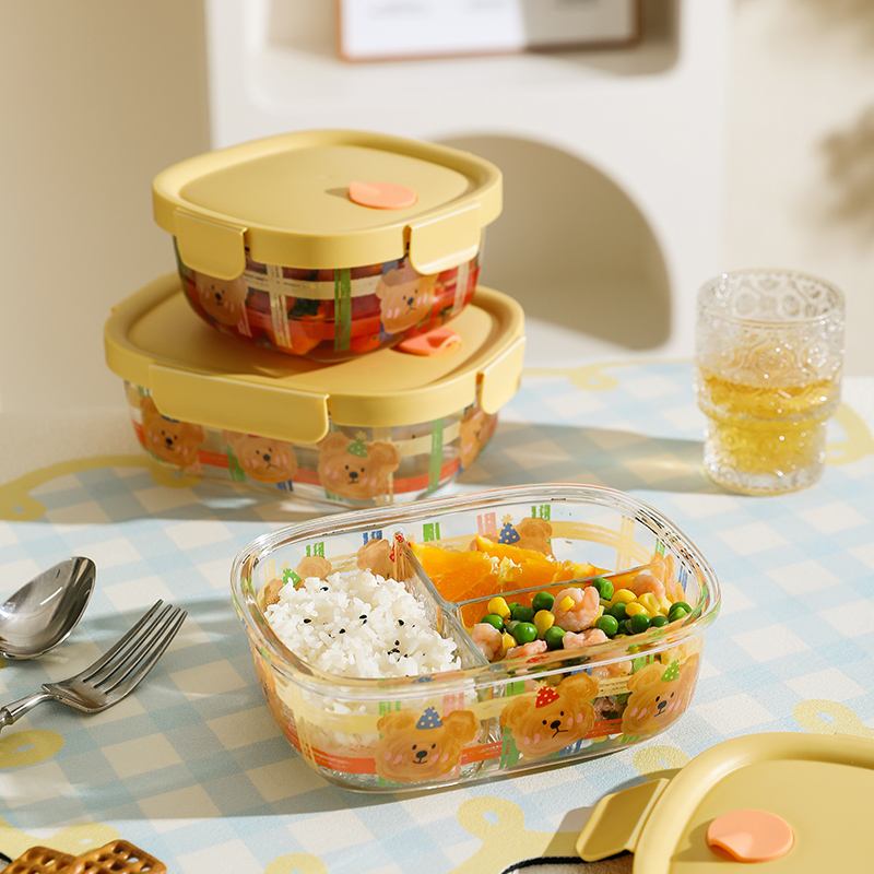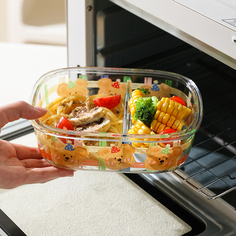 舍里卡通玻璃饭盒微波炉加热专用分隔保鲜盒上班族便当盒带饭餐盒