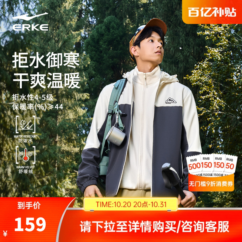 鸿星尔克外套男秋冬男士运动软壳冲锋防泼水风衣男生夹克加绒上衣