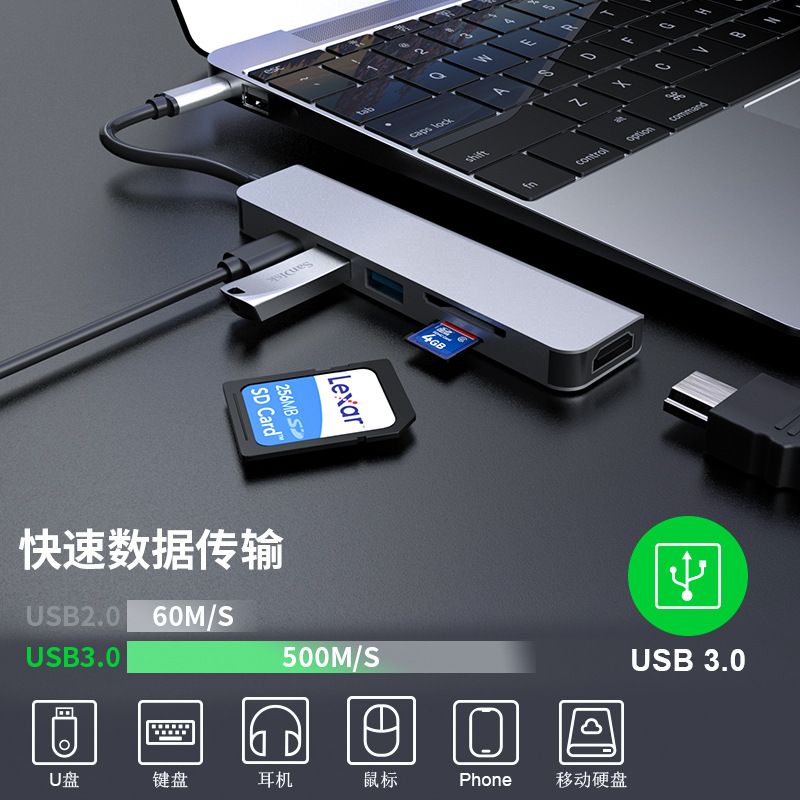 新款六合一扩展坞USBC HUB转HDTV扩展USB3.0SD加TF typec拓展坞