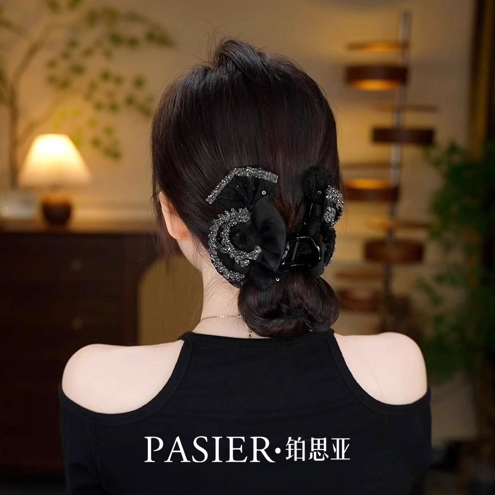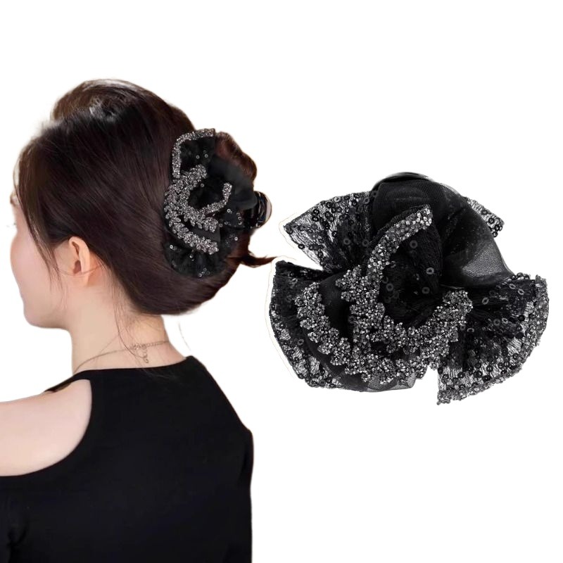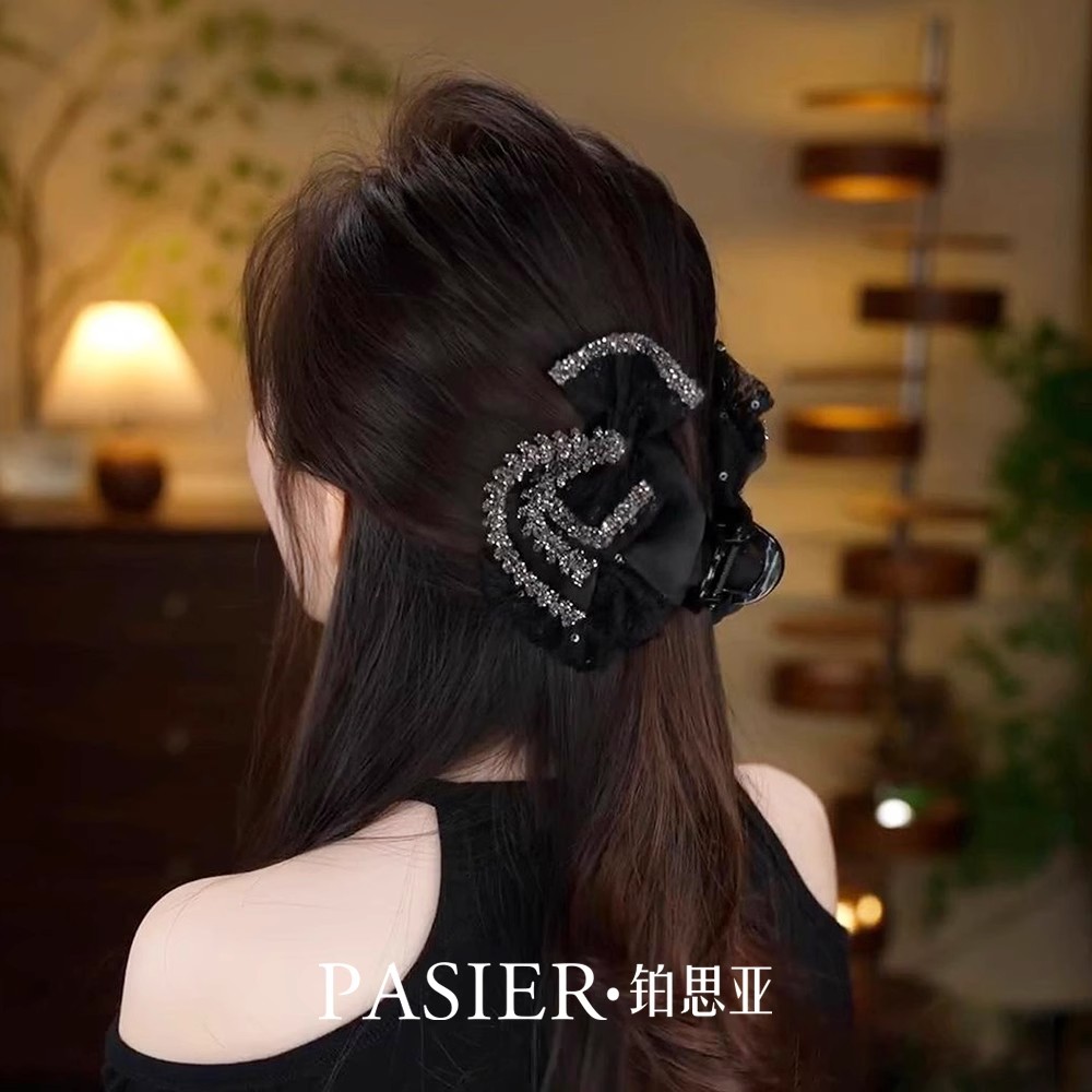 新款东方之珠发夹女时尚欧根纱蝴蝶结鲨鱼夹蓬松显发量抓夹头饰