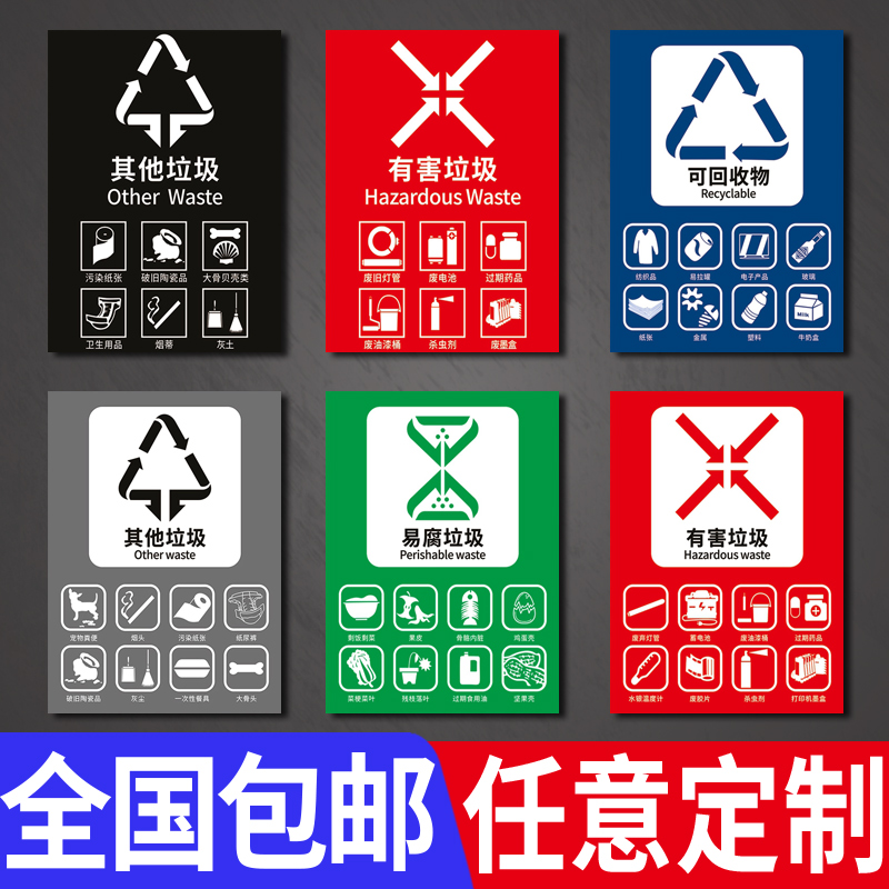 垃圾分类标识贴纸 国标环卫大垃圾桶标签不可回收有害厨余干湿其他易腐其余生活垃圾温馨提示指示标志警示牌