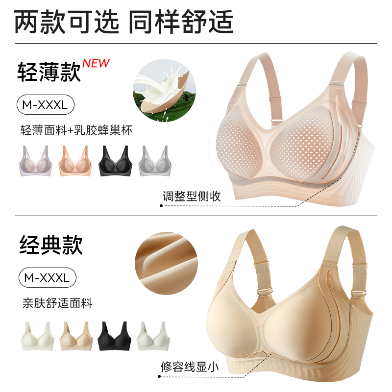 润微提拉女王内衣女夏薄款大胸显小无痕大码调整防下垂粉底液文胸