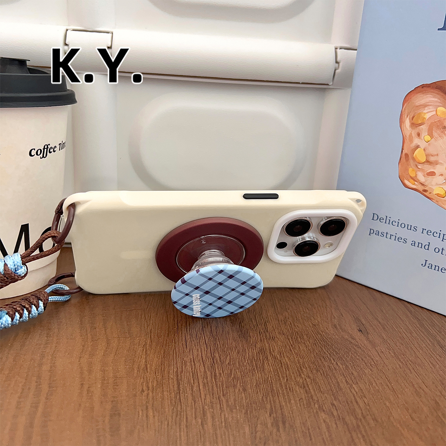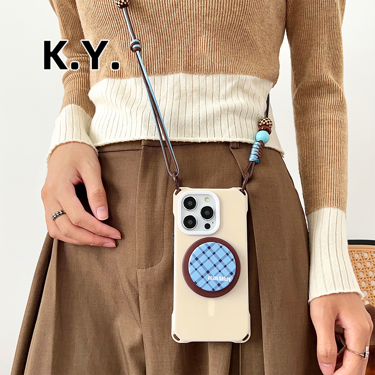 蓝格纹棕底菲林磁吸支架挂绳斜挎手机壳适用于苹果17/16Pmmate70/60Pro手提珠链x200四角开孔15/14ultra硬壳