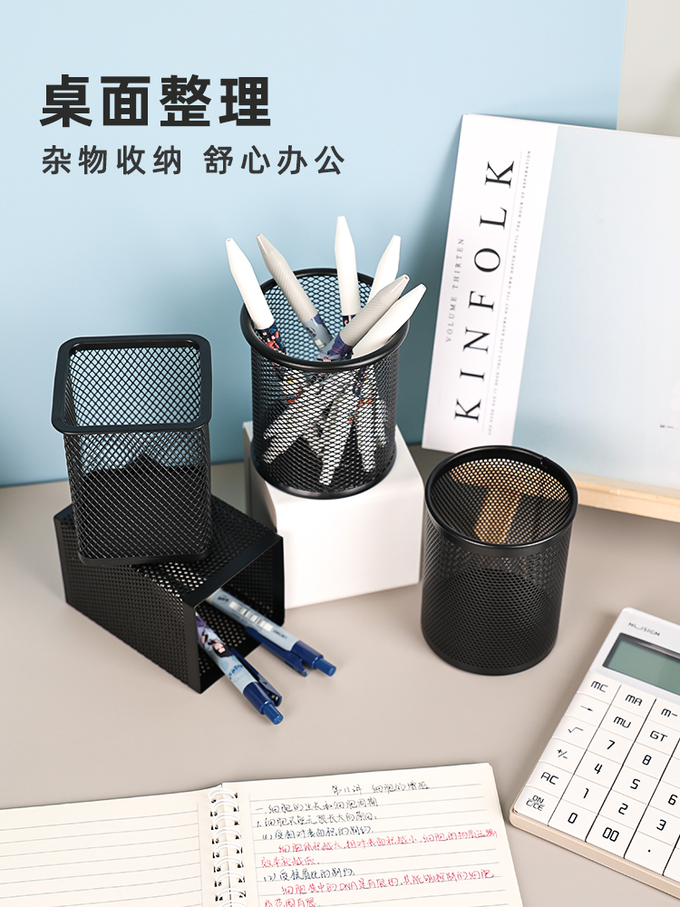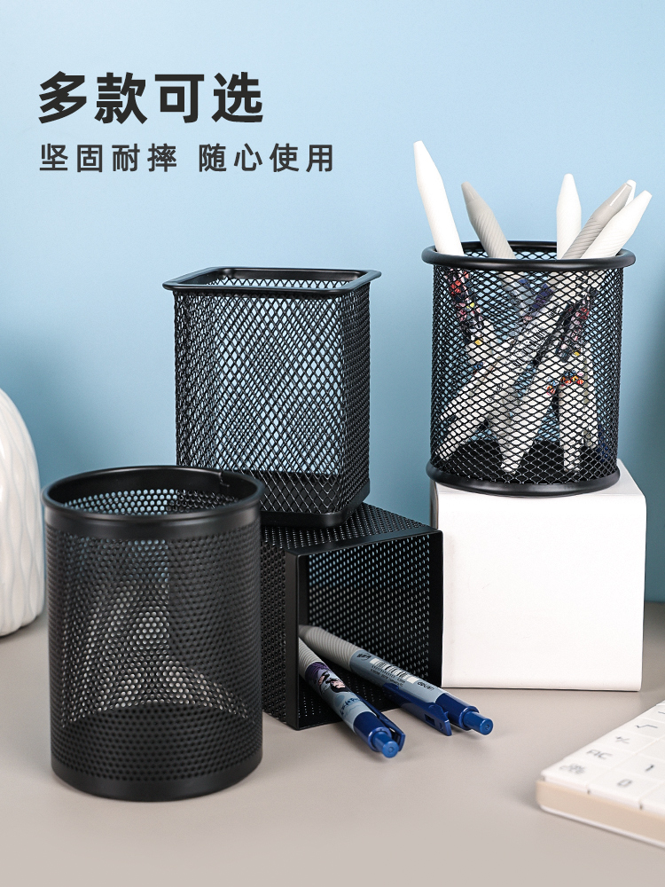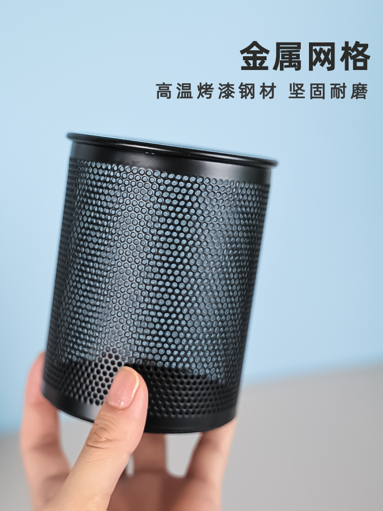 得力笔筒圆形金属网格笔插文具商务笔类收纳简约网纹创意时尚化妆刷收纳筒笔盒大容量多功能简约办公用品