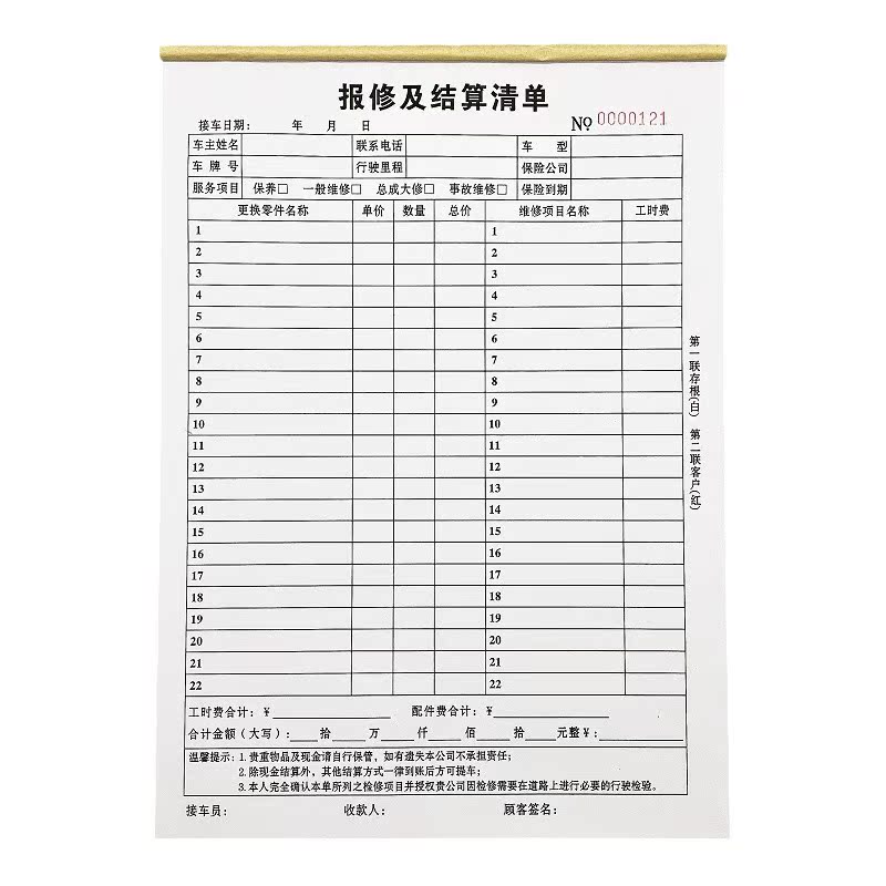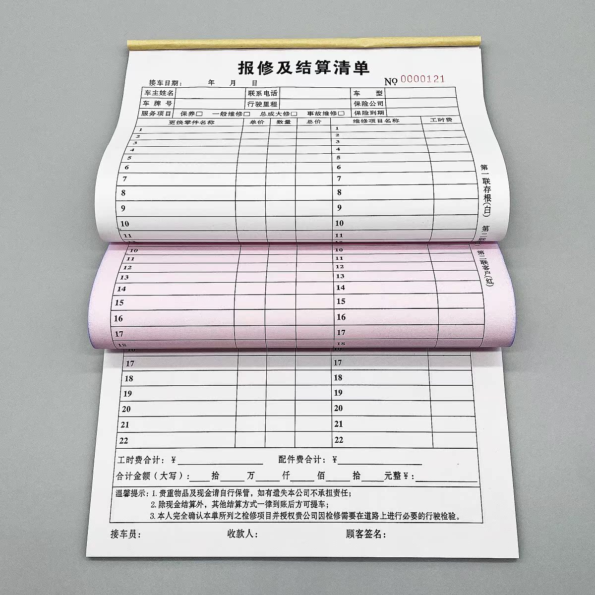 车辆报修及结算清单定制三联机动车维修接车单汽车保养施工收费单