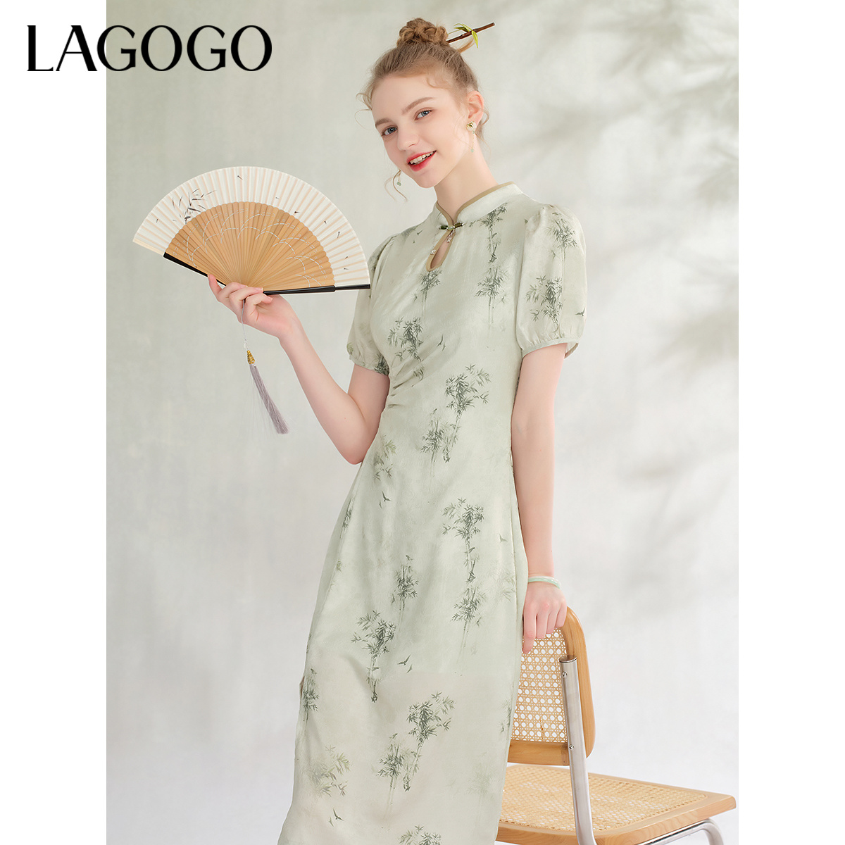 Lagogo拉谷谷开叉新中式改良旗袍女2024夏新款薄荷曼波竹叶连衣裙