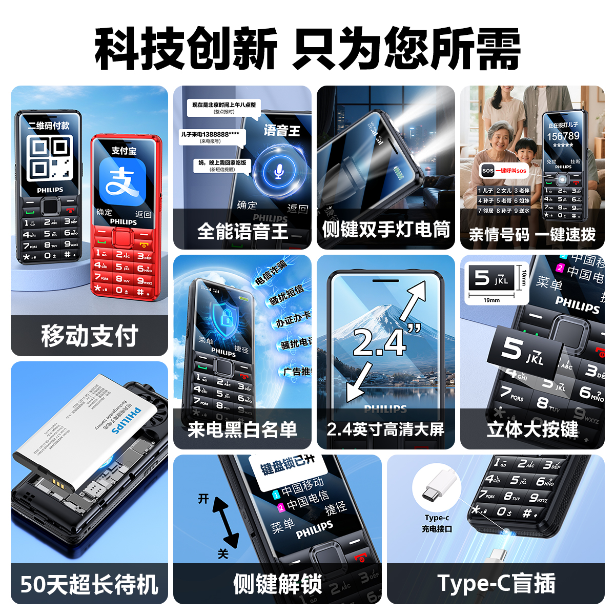 [官方旗舰店]飞利浦2025新款老年机4G全网通E539A官方正品超长待机老人机大屏大字大声音学生机按键老年手机