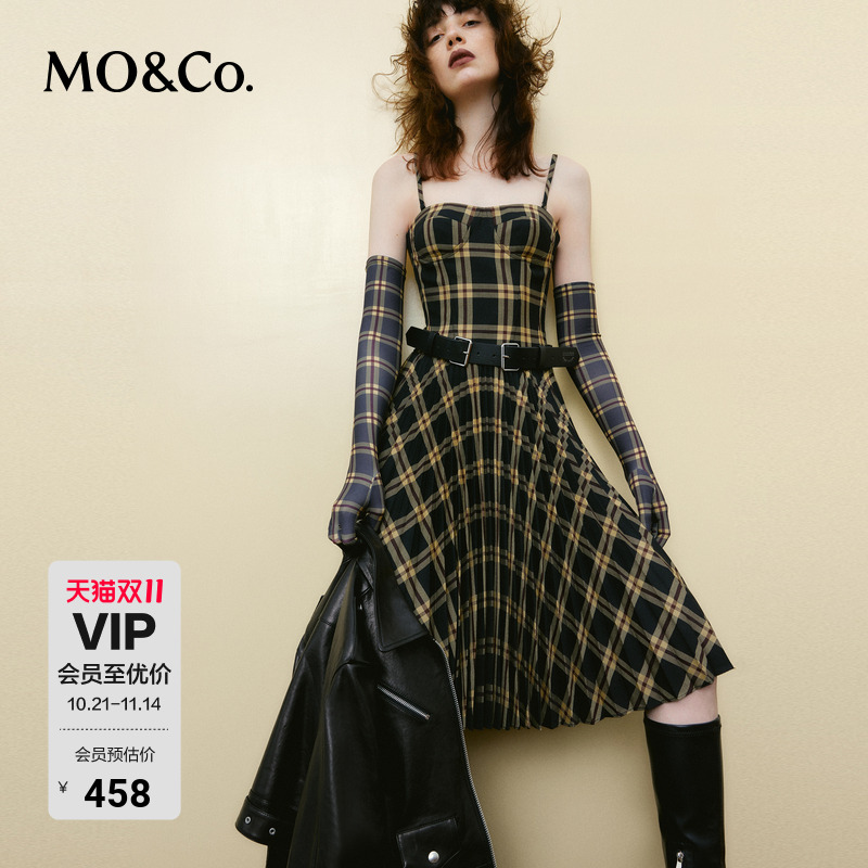 MOCO连衣裙春(装卸袖套/皮带/肩带)鱼骨胸托压褶格纹吊带摩安珂