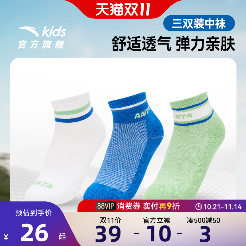 安踏儿童袜子三双装男童女童运动袜2025秋季新款亲肤棉袜子弹力袜
