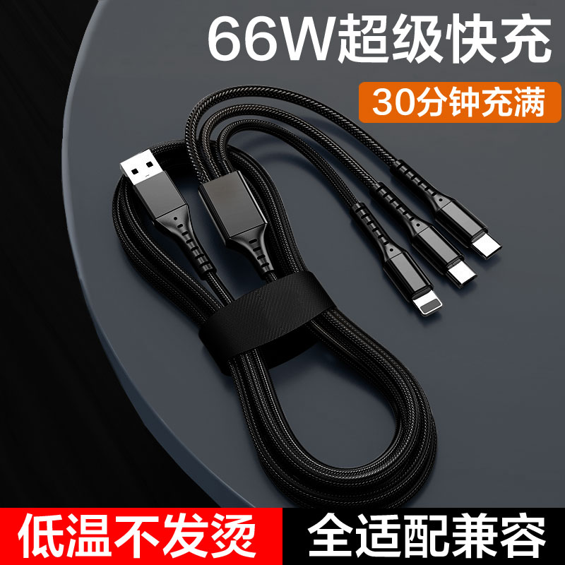 三合一数据线充电线器66W手机快充一拖三6A适用于苹果华为40安卓5A typec三头万能车载多功能通用线原据
