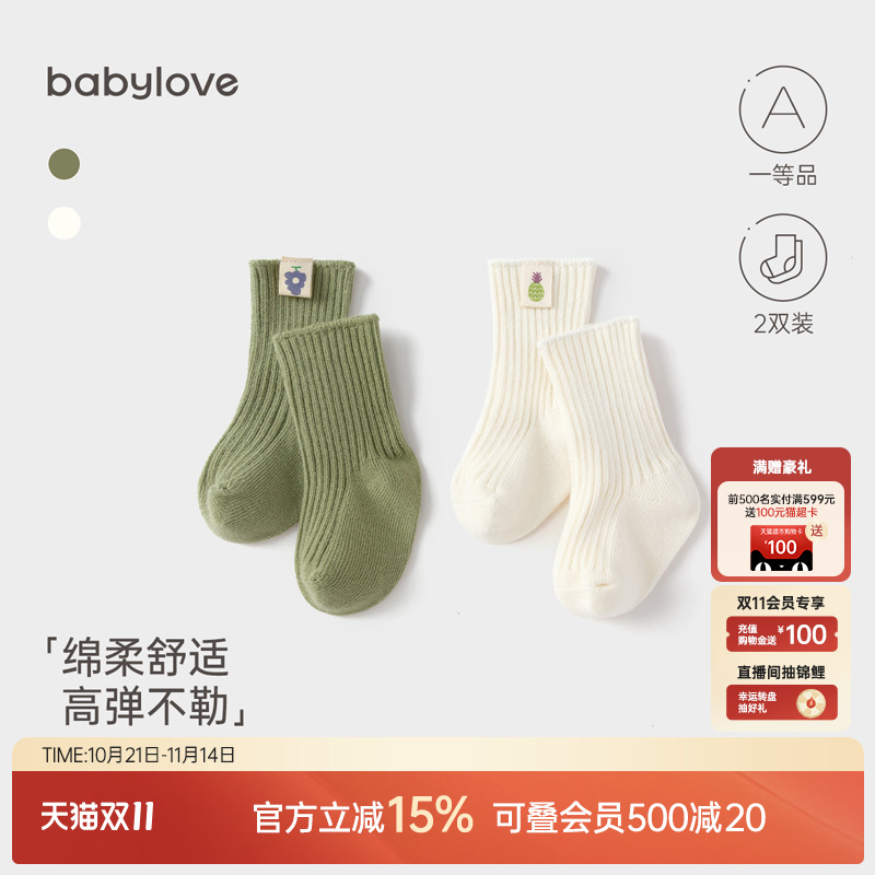 babylove婴儿袜子秋冬宝宝护脚袜套纯色百搭中筒袜高弹不勒2双装