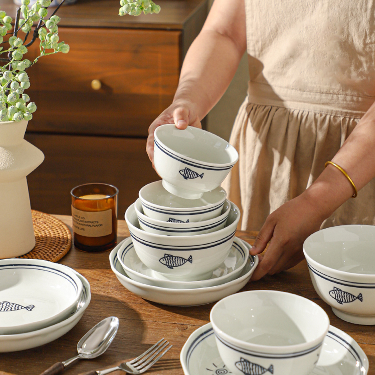 舍里年年有鱼陶瓷米饭碗家用餐具套装釉下彩碗盘碗碟组合简约菜盘